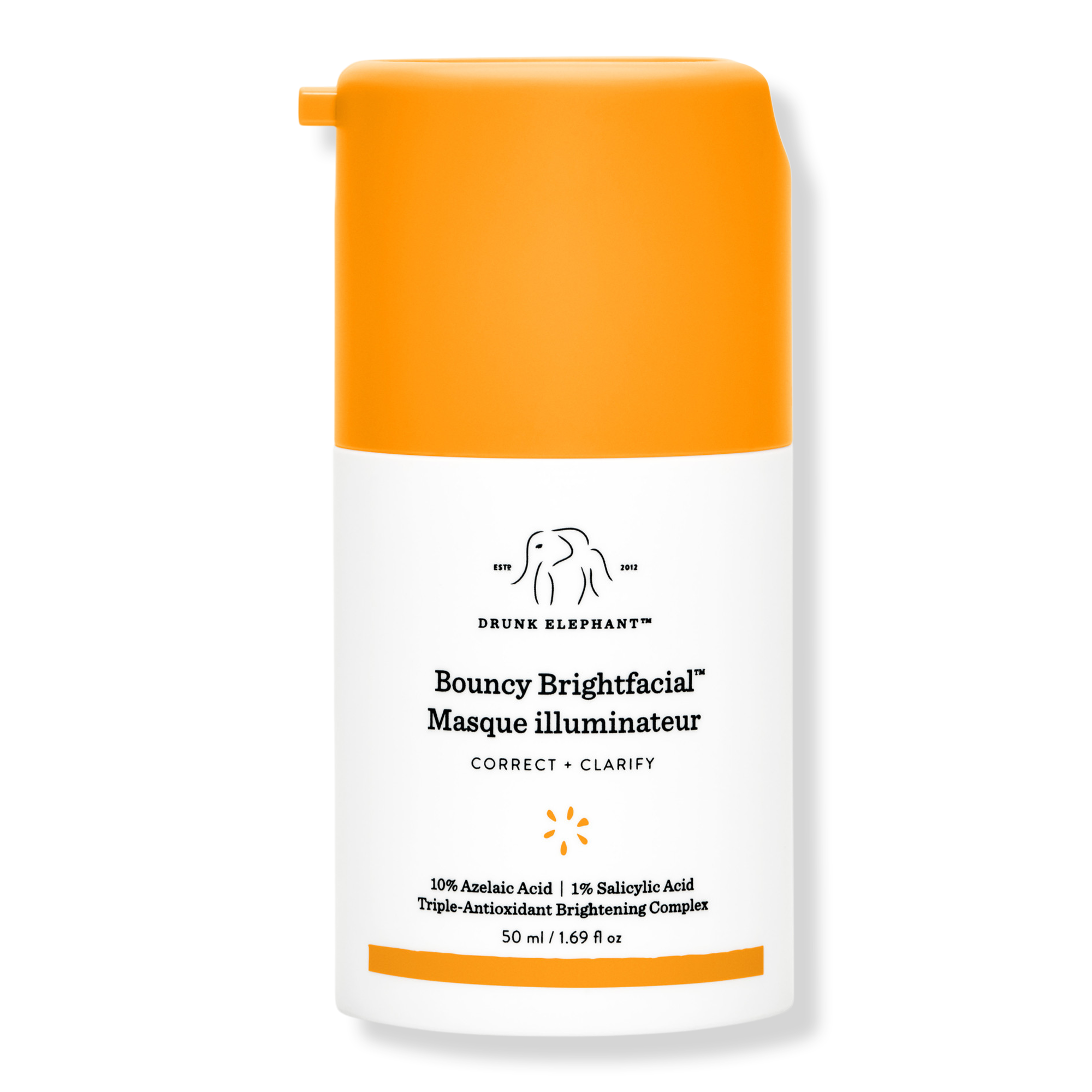 Drunk Elephant's Bouncy Brightfacial Brightening Mask is a radiance-boosting leave-on mask that delivers 10% azelaic and 1% salicylic acids to clarify tone, fade spots, and reduce redness, revealing a brighter, bouncier, more even complexion.