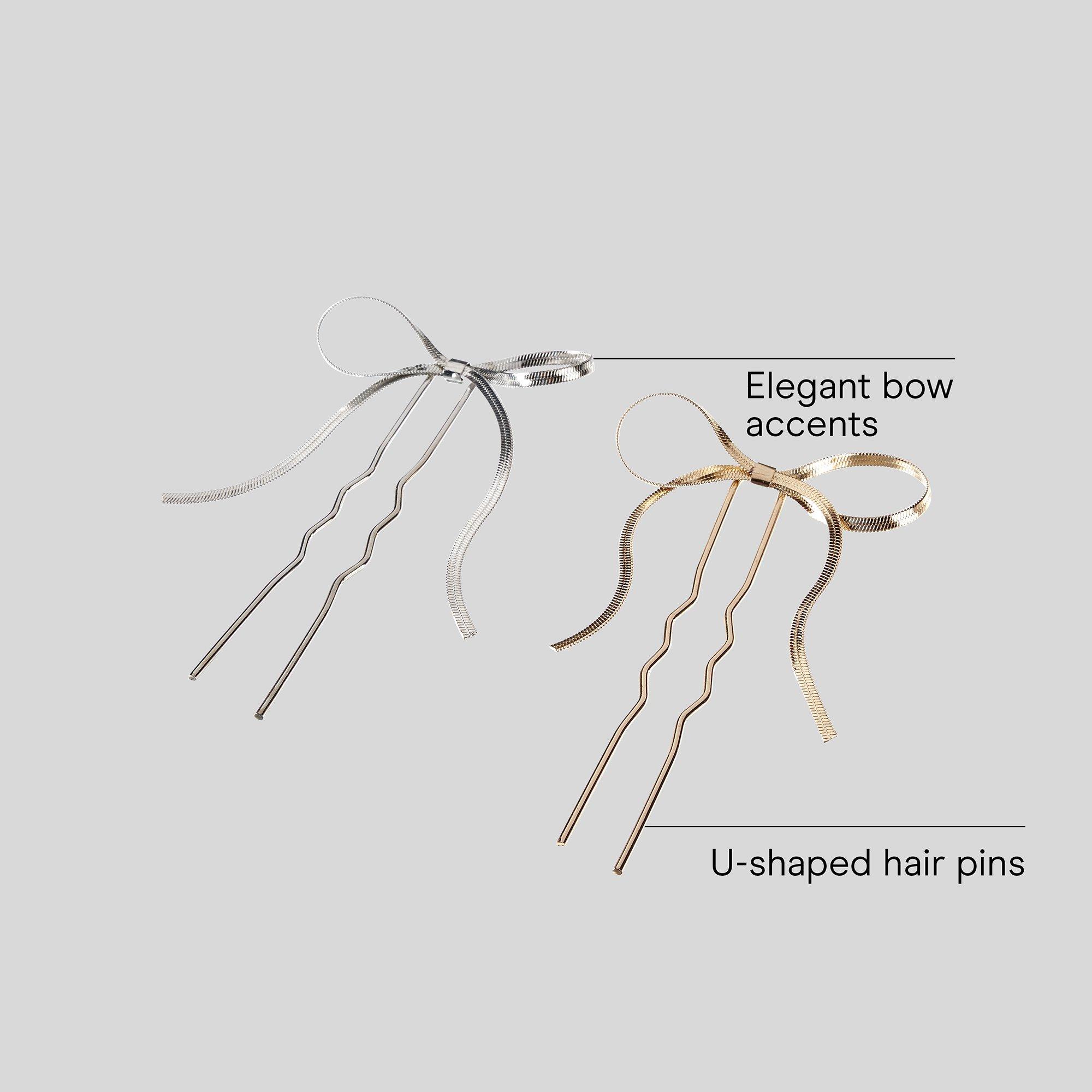 Beautifully crafted Conair U-shaped hair pins feature elegant bow accents in silver-tone and gold-tone metal. Designed to slide easily into hair, they provide a secure, discreet hold that lasts all day.