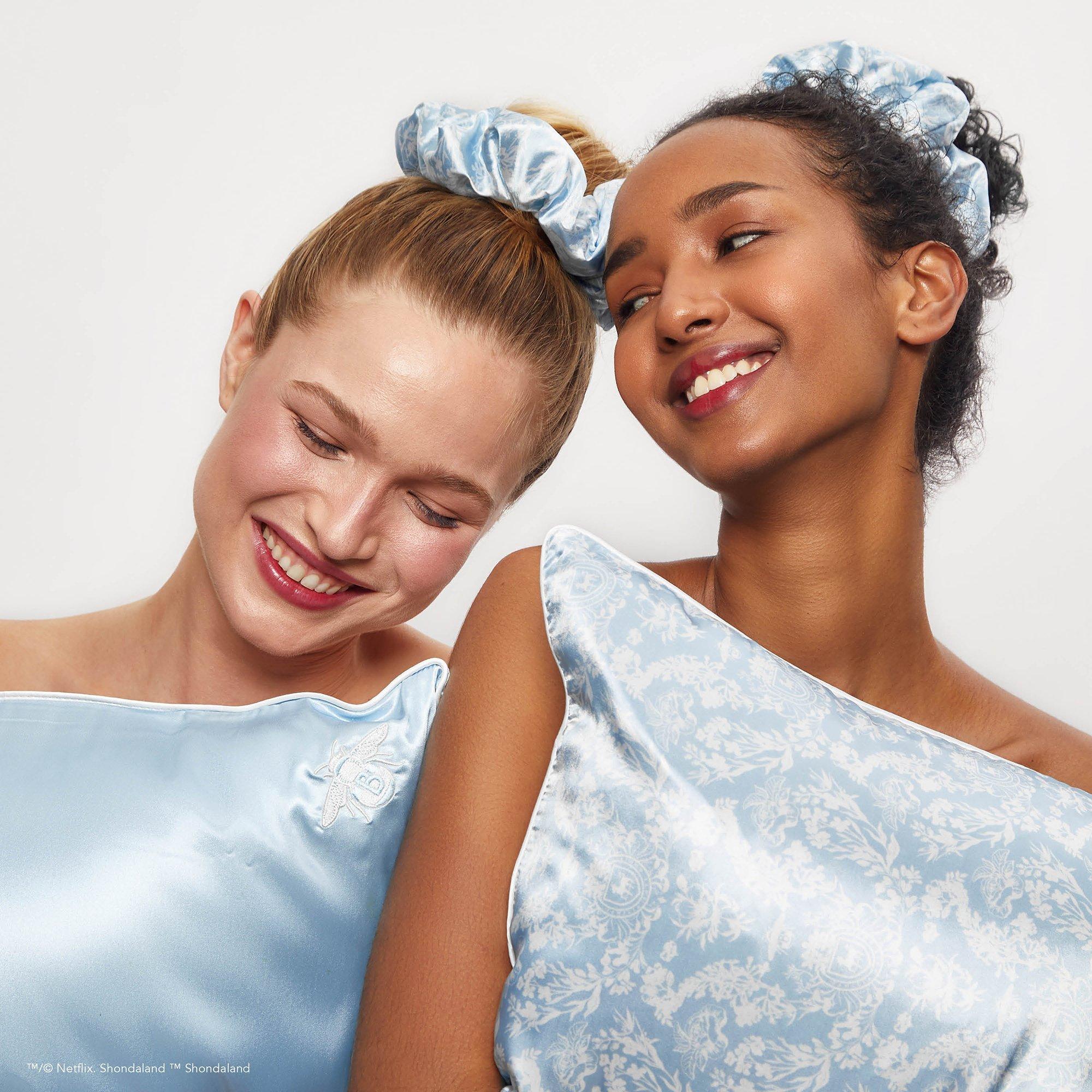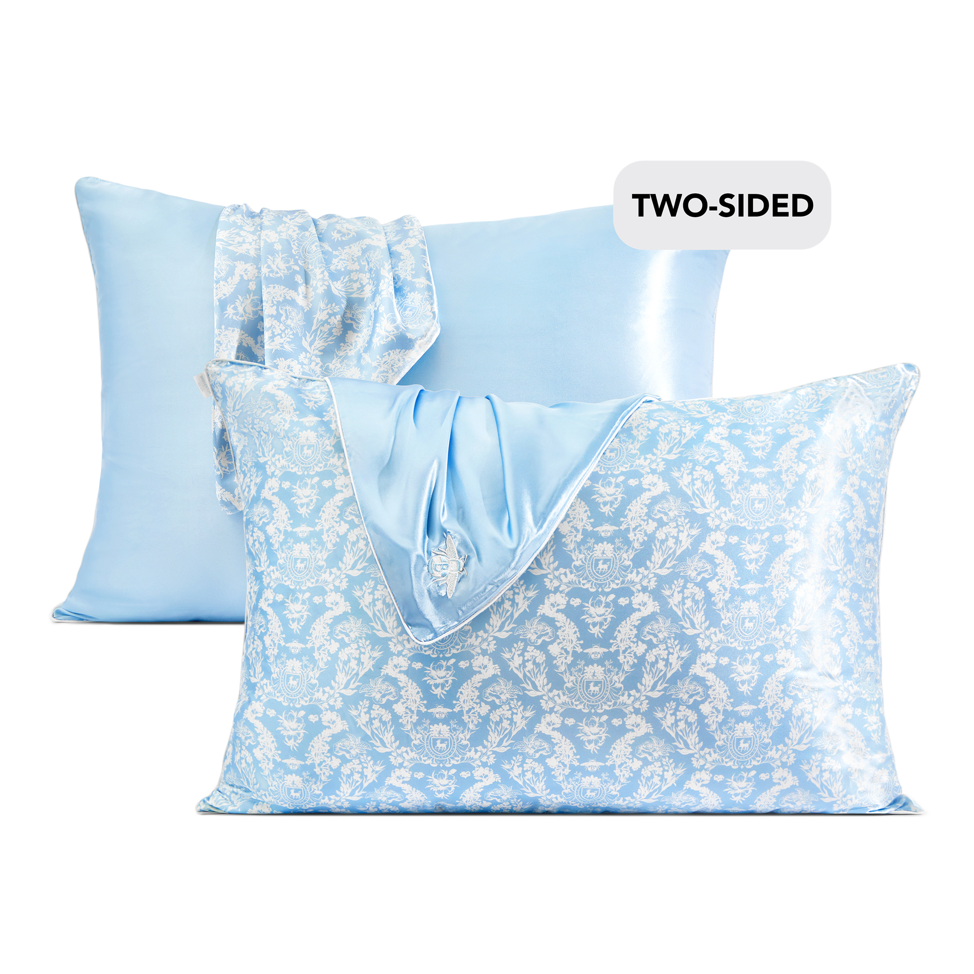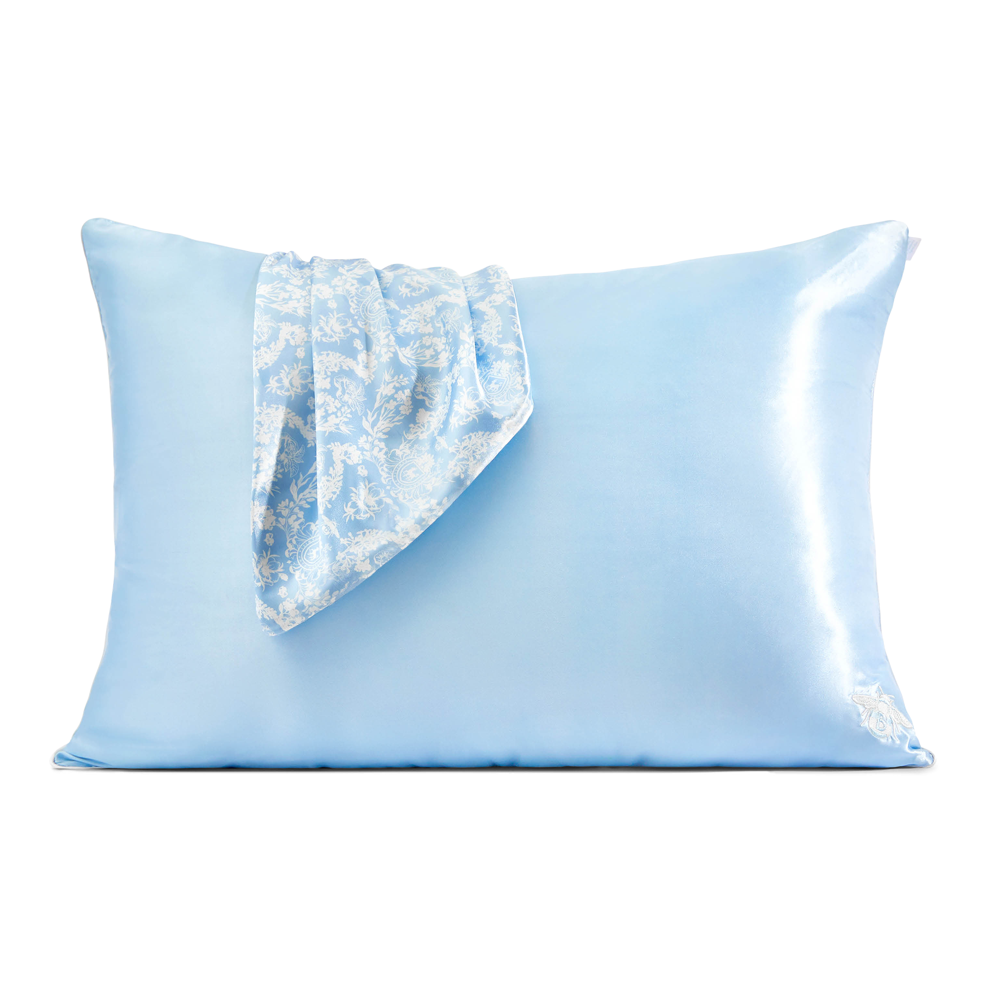 Swoon-worthy Standard satin pillowcase featuring an elegant, Bridgerton-inspired toile print on one side and solid blue on reverse.