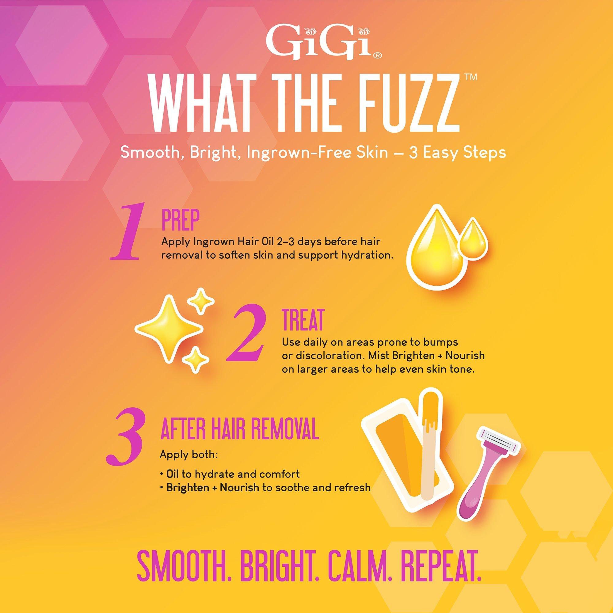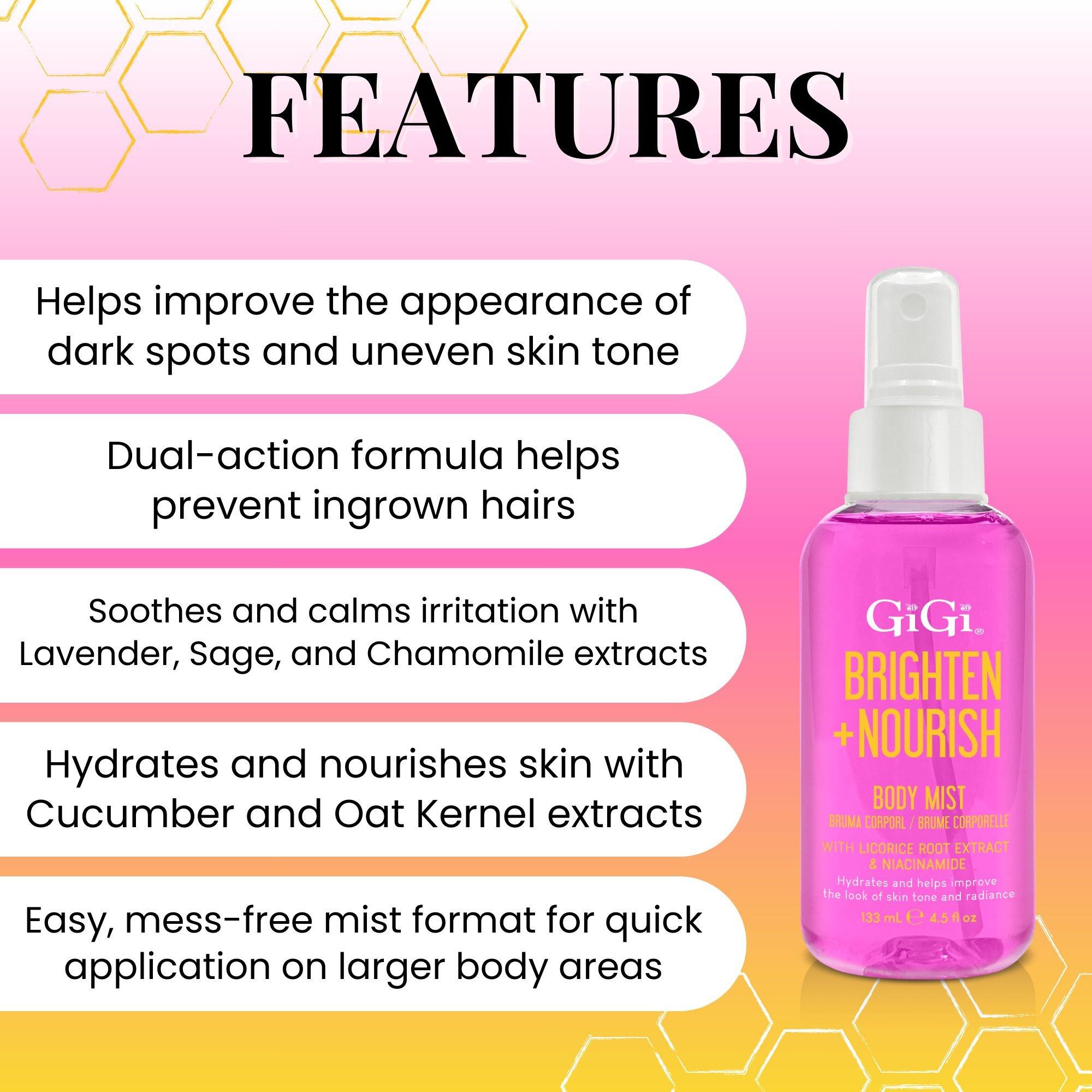 GiGi BRIGHTEN + NOURISH Body Mist is a 2-in-1 hydrating and toning treatment that helps brighten dark spots and nourish skin.