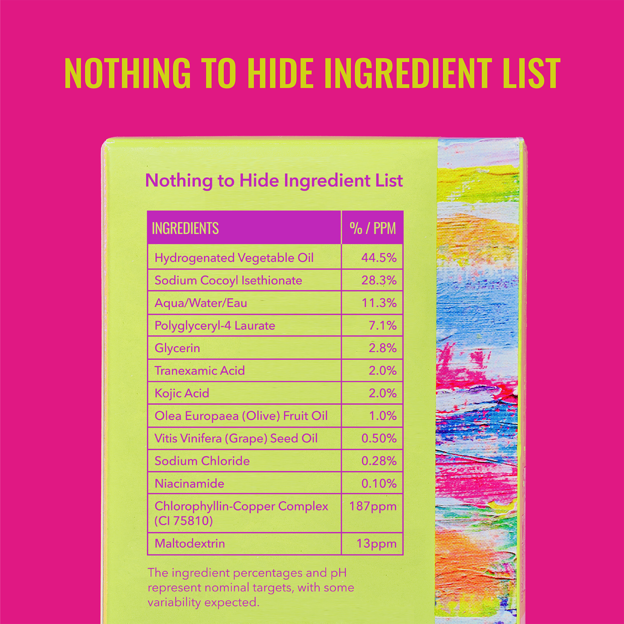 Hydrogenated Vegetable Oil, Sodium Cocoyl Isethionate, Aqua/Water/Eau, Polyglyceryl-4 Laurate, Glycerin, Tranexamic Acid, Kojic Acid, Olea Europaea (Olive) Fruit Oil, Vitis Vinifera (Grape) Seed Oil, Sodium Chloride, Niacinamide, Chlorophyllin-Copper Complex (CI 75810), Maltodextrin.