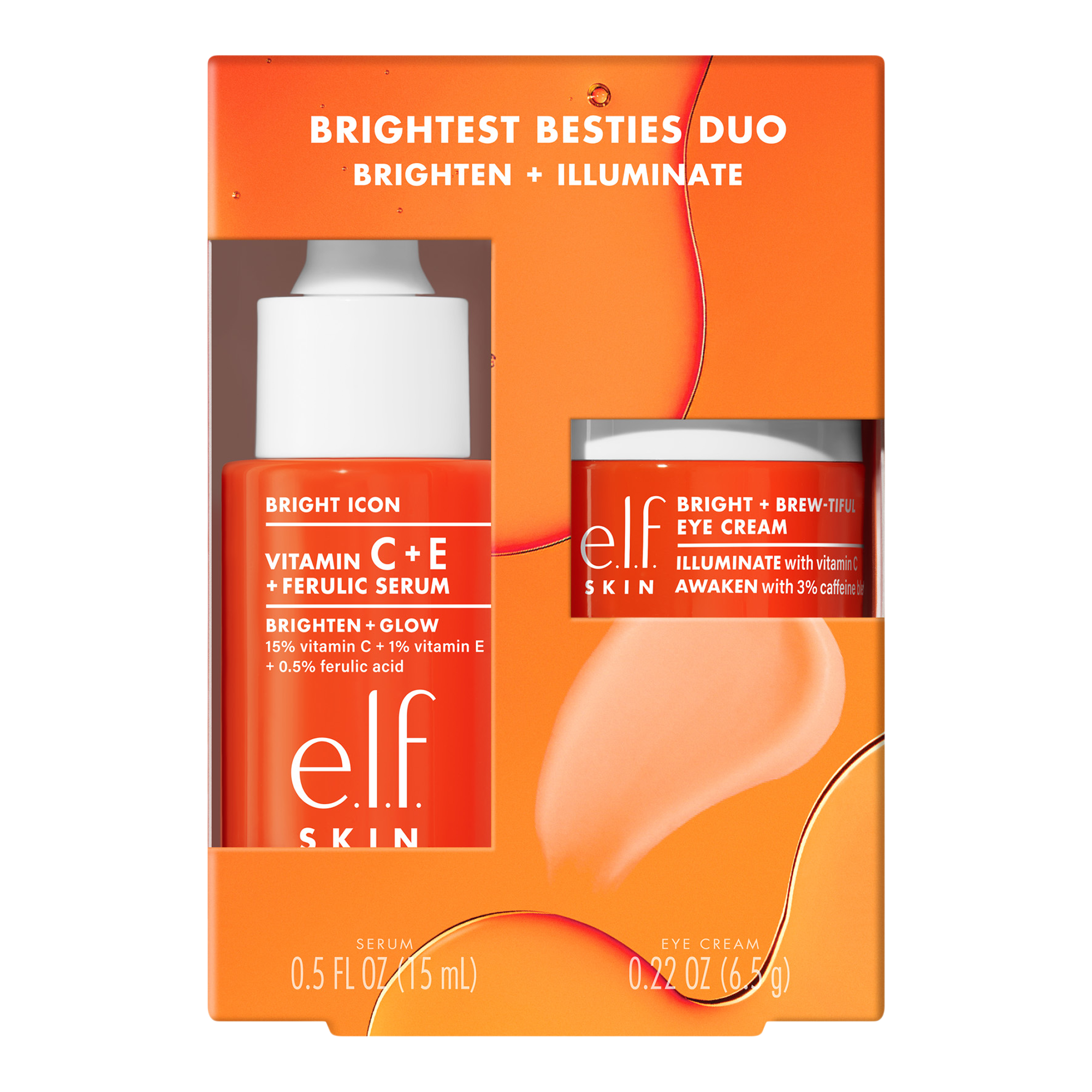 Start your day off bright with e.l.f. SKIN’s Brightest Besties Duo. This travel-sized brightening skincare set features an antioxidant serum that boosts radiance with a triple threat of 15% vitamin C, plus a lightweight eye cream that’s packed with vitamin C to brighten the look of dark circles.