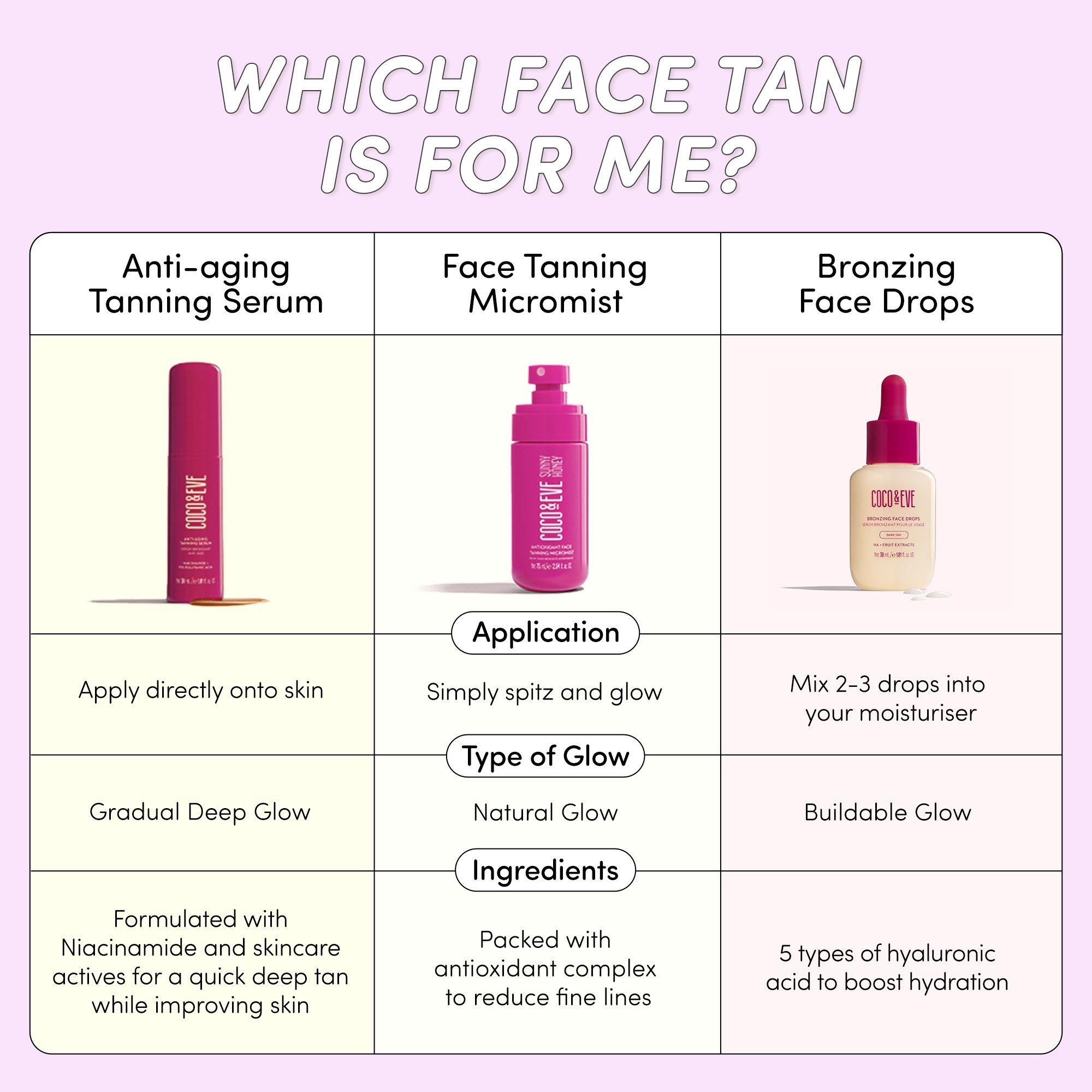 Achieve a natural, sun-kissed glow while hydrating and plumping your skin. Coco & Eve Bronzing Face Drops deliver a subtle, gradual and buildable tan. Infused with Hyaluronic Acid, Dragon Fruit, and natural DHA for a customized Bali-inspired bronze.