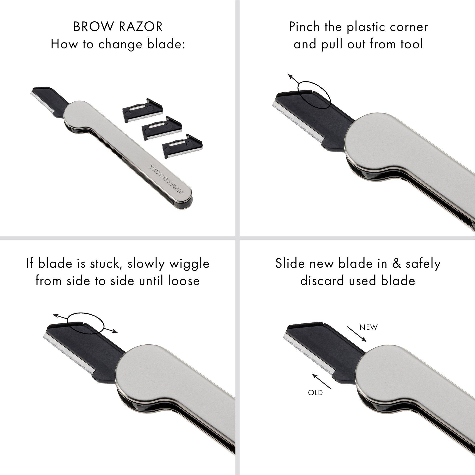 Tweezerman's Brow Essentials Set for long lasting precision. Set includes refillable Folding Brow Razor, Mini Slant Tweezer, Spoolie Brush and replacement blades for an all in one essentials grooming set.