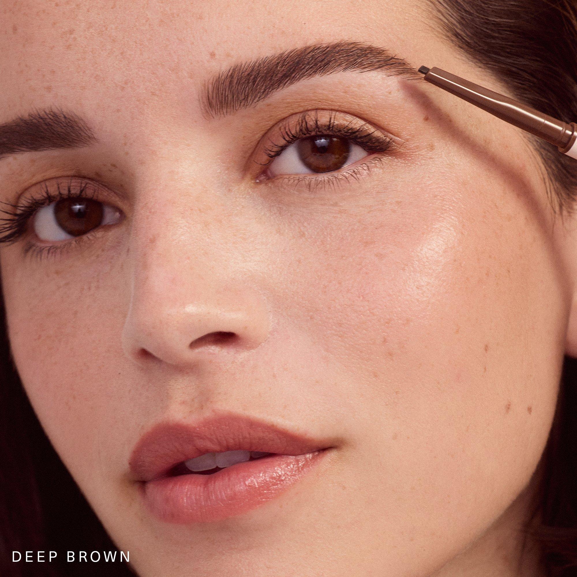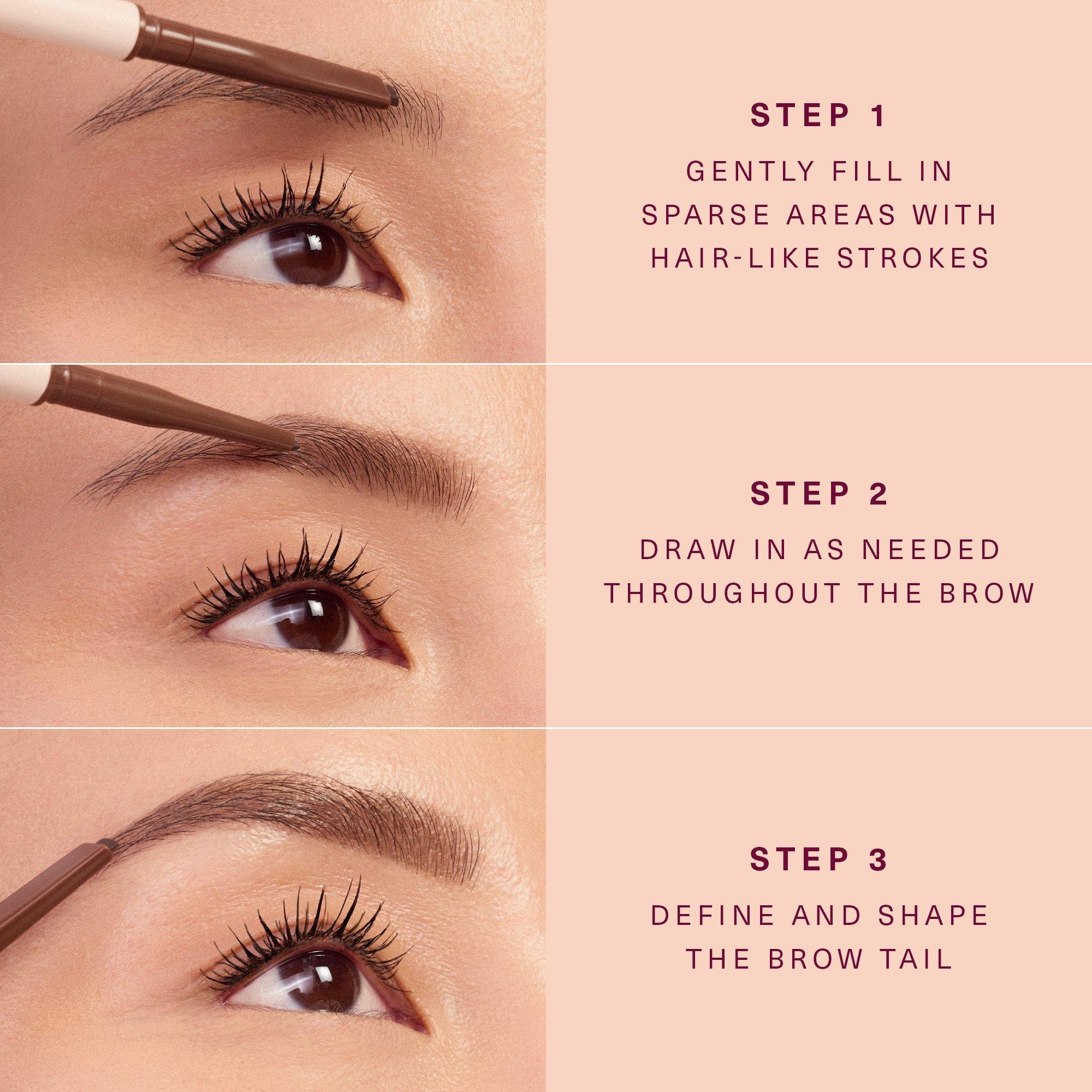 Twist pencil to reveal a small amount of product. Use the precision angled tip to fill in brows by drawing short, hair-like strokes in the direction of your natural hair growth.