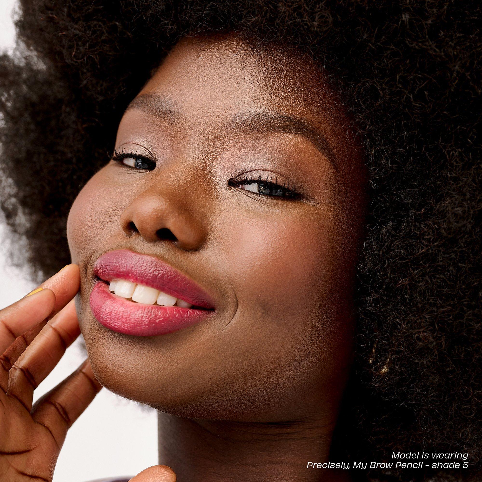 Apply Precisely, My Brow Pencil using light, short strokes. Blend with spoolie. Stroke Gimme Brow+ along brows to volumize. Brush 24-HR Brow Setter through brows.
