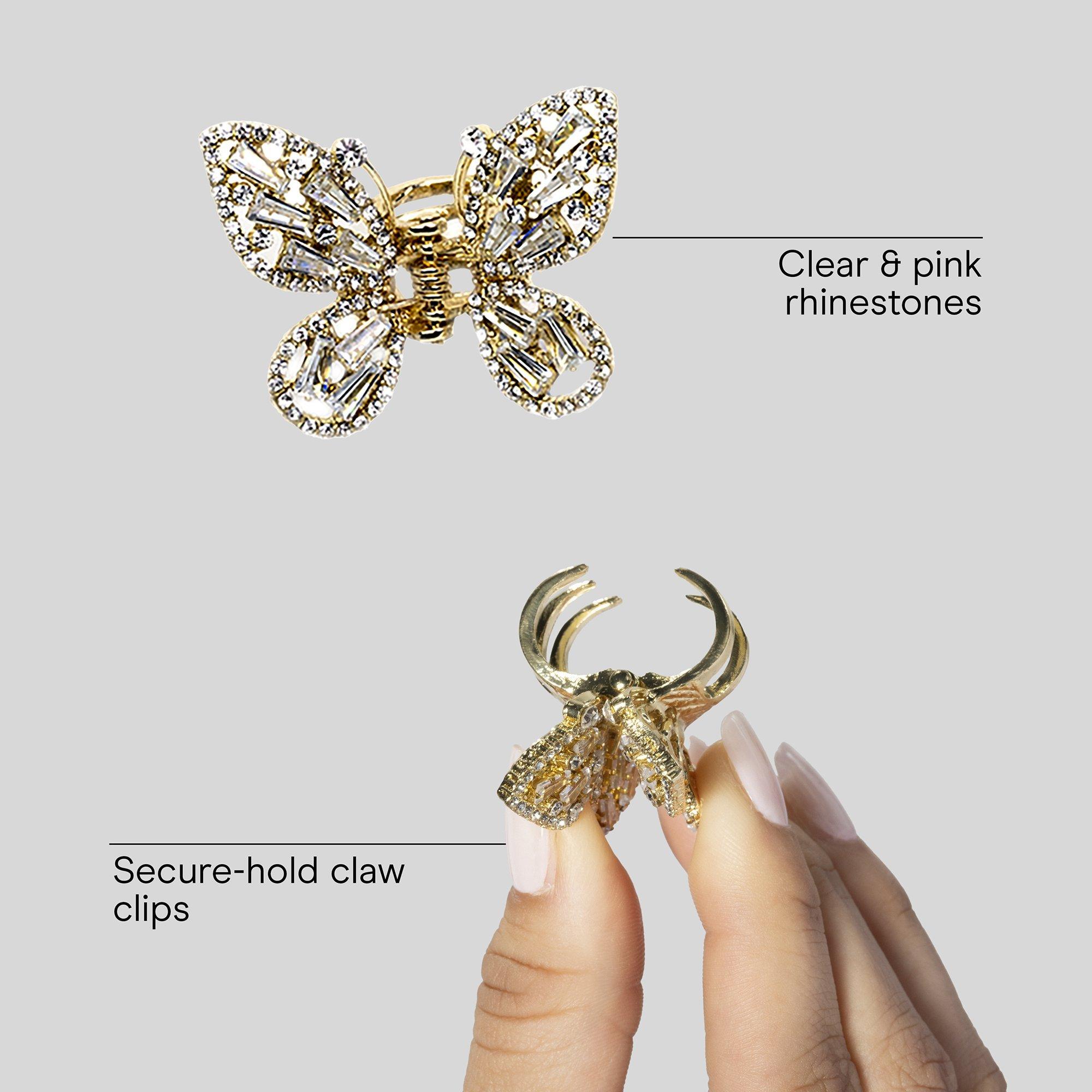 Conair Butterfly Claw Clips decorated with clear and pink stones add a playful, elegant touch. Designed for a comfortable secure hold that keeps hair in place.