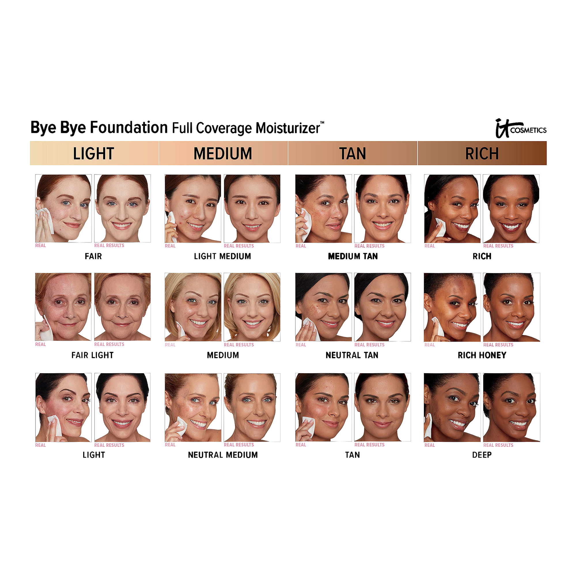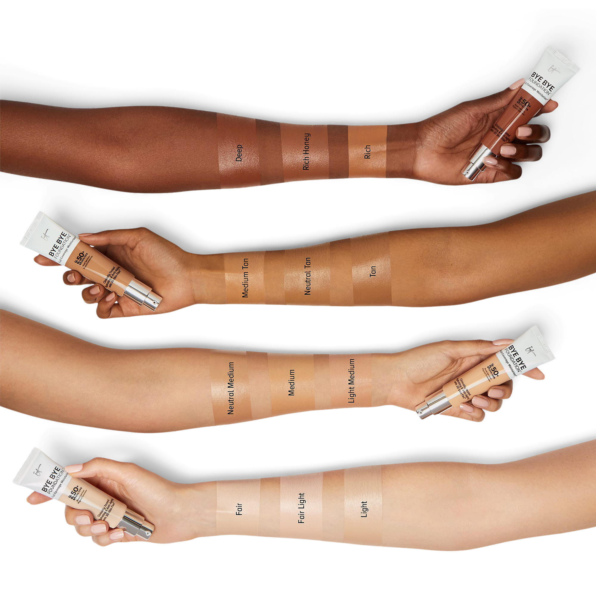 Discover IT® Bye Bye Foundation - your first-ever full coverage moisturizer from IT Cosmetics that gives you the power to say 'bye bye' to traditional foundation! Featuring proprietary 3D Skin Flex Technology, this color-infused moisturizer uses flexible pure color pigments that 'float' over lines.