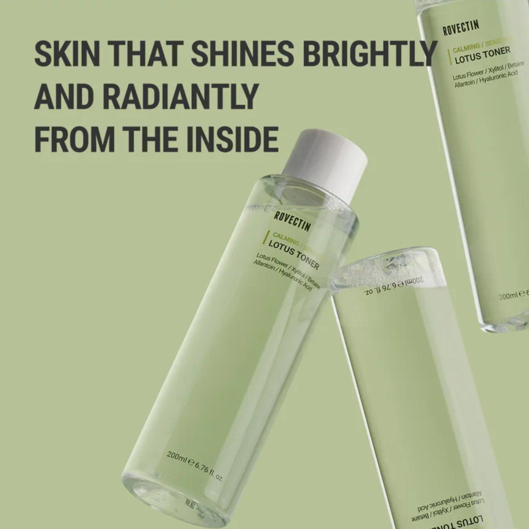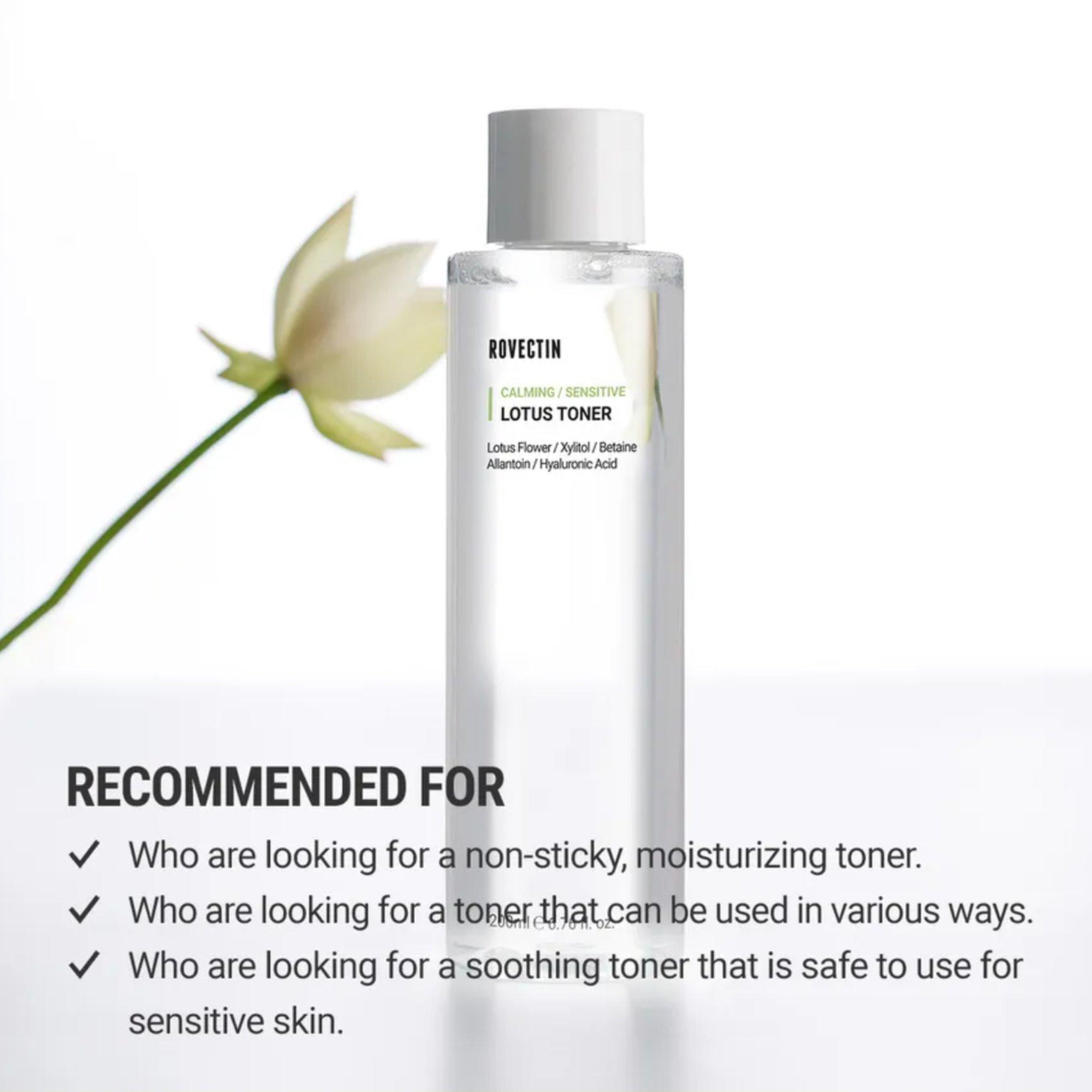 Rovectin Calming Lotus Toner is a soothing toner with Lotus Flower Extract and 7 layers of Hyaluronic Acid that hydrates and balances skin for a calm, refreshed feel.