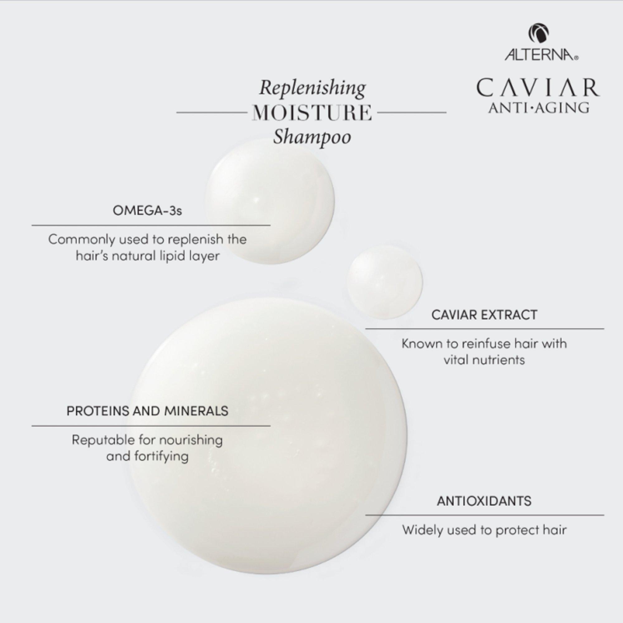 Alterna Caviar Anti-Aging Replenishing Moisture Shampoo. A luxurious cleanser that works to restore moisture while protecting hair from color fade, daily stresses and future damage.