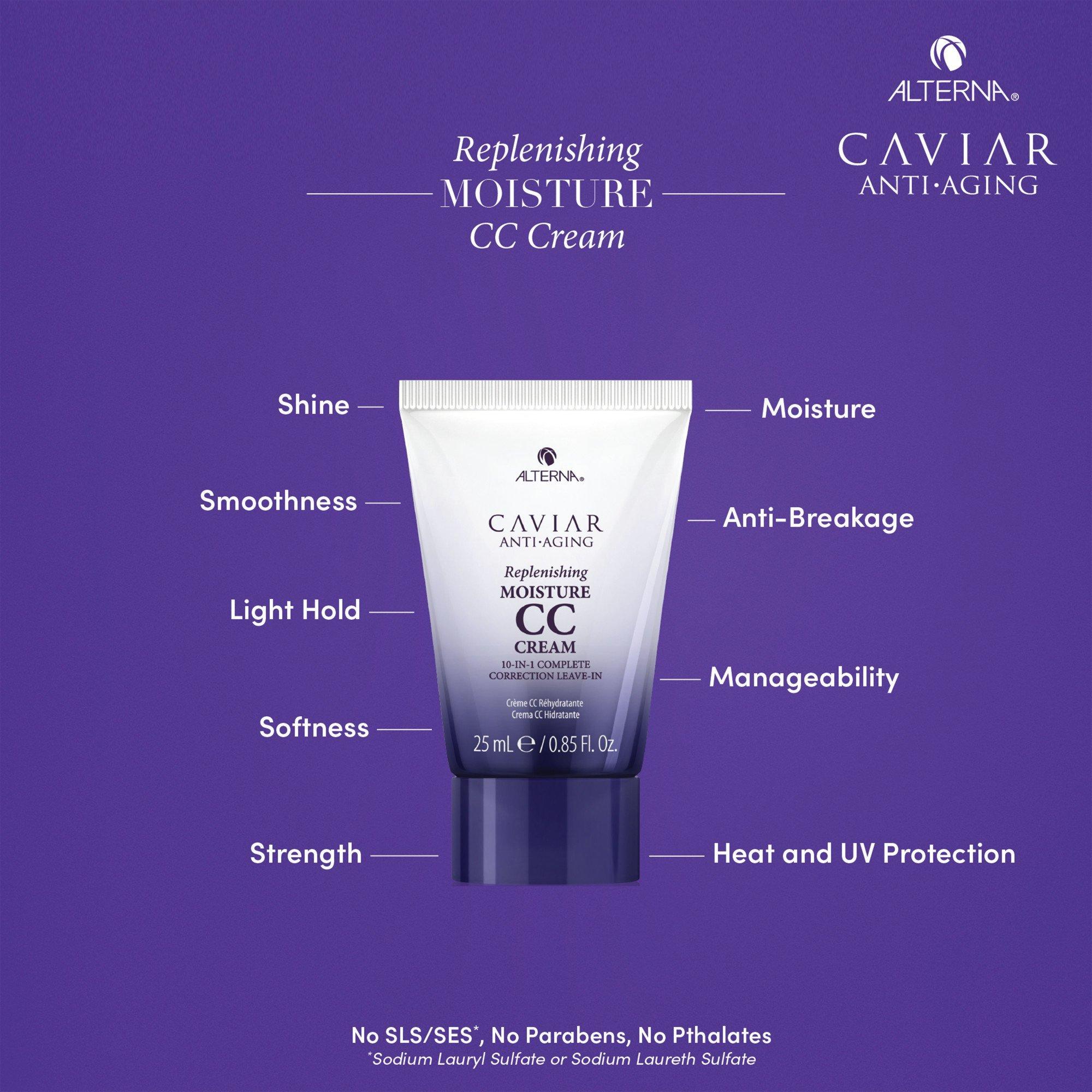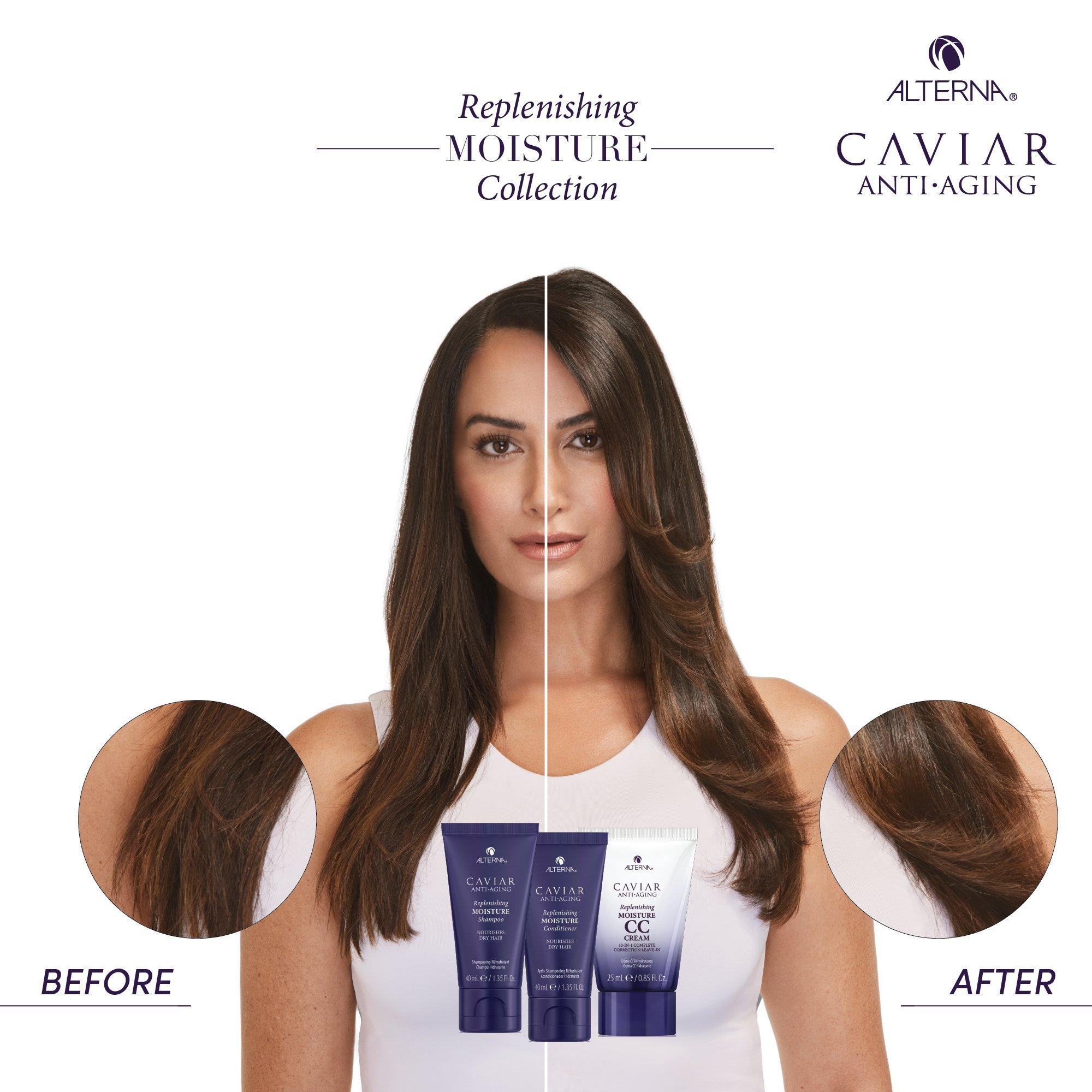 The Alterna Caviar Moisture Essentials Kit contains sulfate and paraben free shampoo and conditioner that provides the ultimate hydrating experience for dry, aging hair. Caviar CC Cream is a miracle leave-in product that delivers 10 benefits in one easy step, leaving hair perfectly polished.
