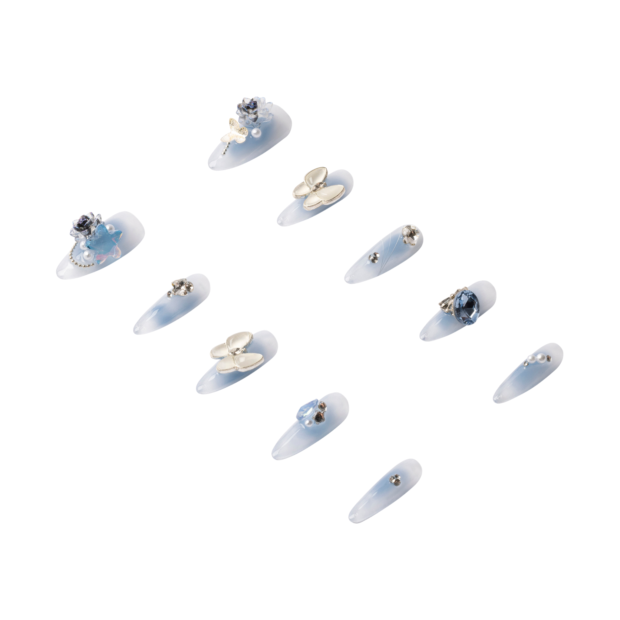 Almond-shaped nails in a dreamy blue shade, finished with butterfly and rose charms. Pearl and gem accents add radiant glow. Handmade, reusable, and crafted from high-quality materials.