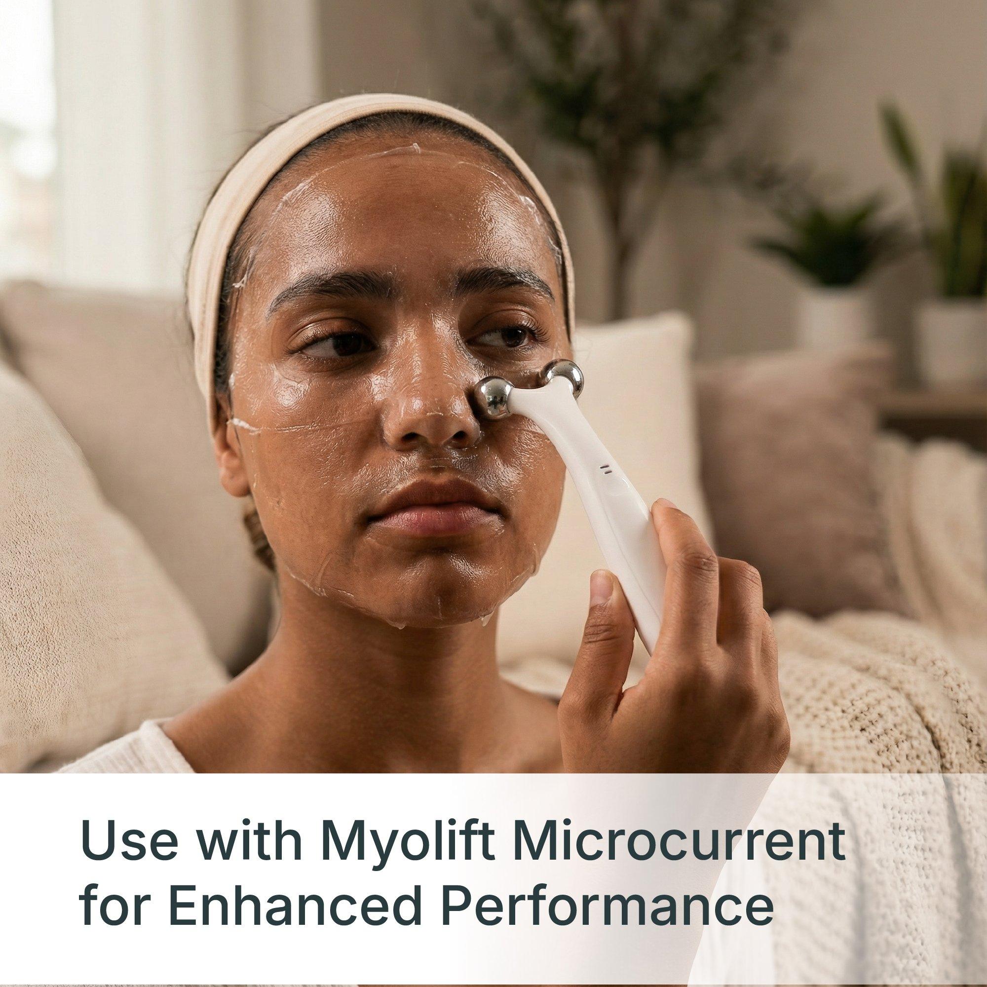 Professional bio-cellulose mask with EGF, Sodium Hyaluronate, Niacinamide, and botanicals. Delivers deep hydration, supports elasticity, calms, and evens tone. Ideal pre/post microcurrent session or for a daily refresh. Visible softness and brightness.