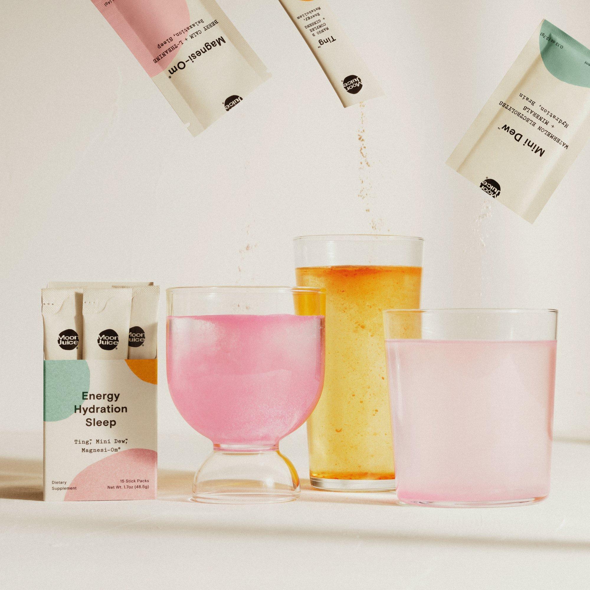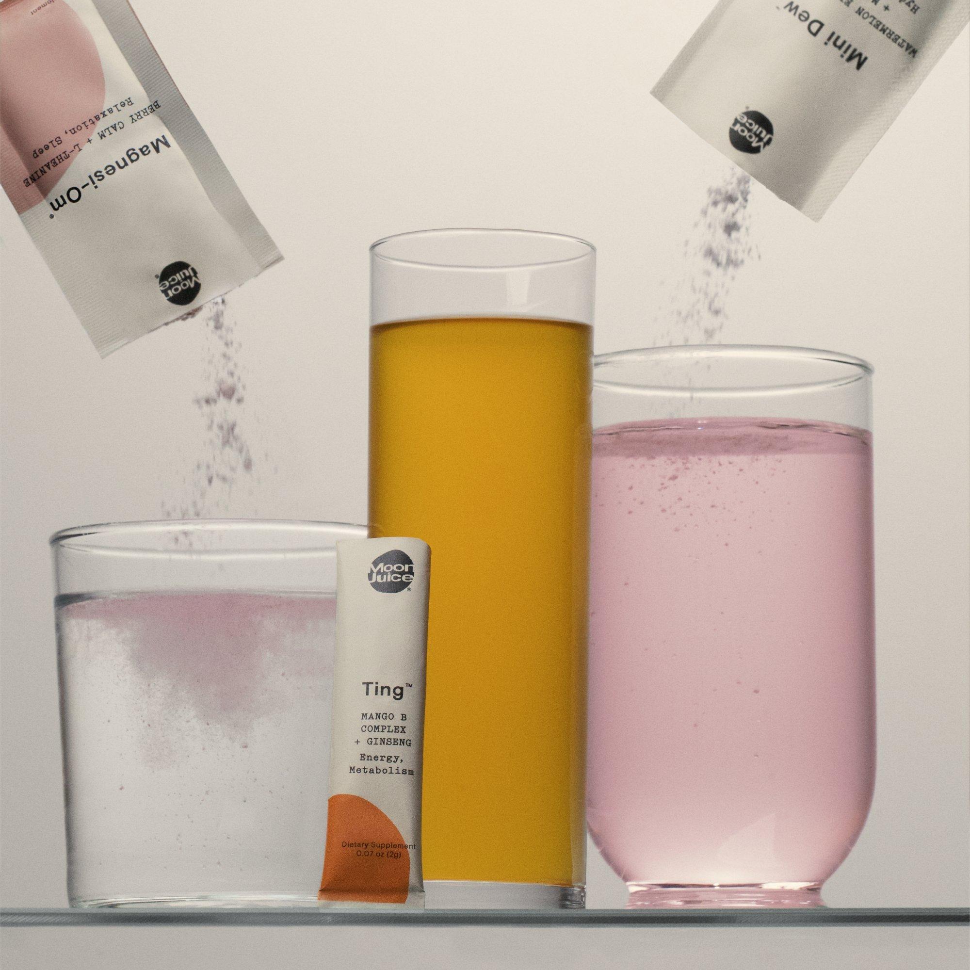 Moon Juice's Cellular Waters Sticks Ting, Mini Dew & Magnesi-Om For Energy, Hydration & Sleep are single servings of cellular waters for energy, hydration, and sleep on the go.