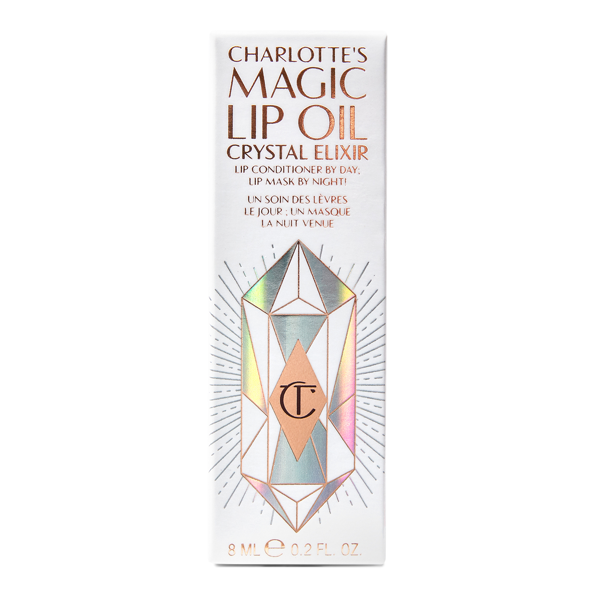 • Charlotte created this lightweight Lip Oil Crystal Elixir for a quick, easy solution to dry lips. Not only do lips look hydrated and luscious, but their overall smoothness is improved with enhanced texture for velvet-soft lip liner and lipstick application.