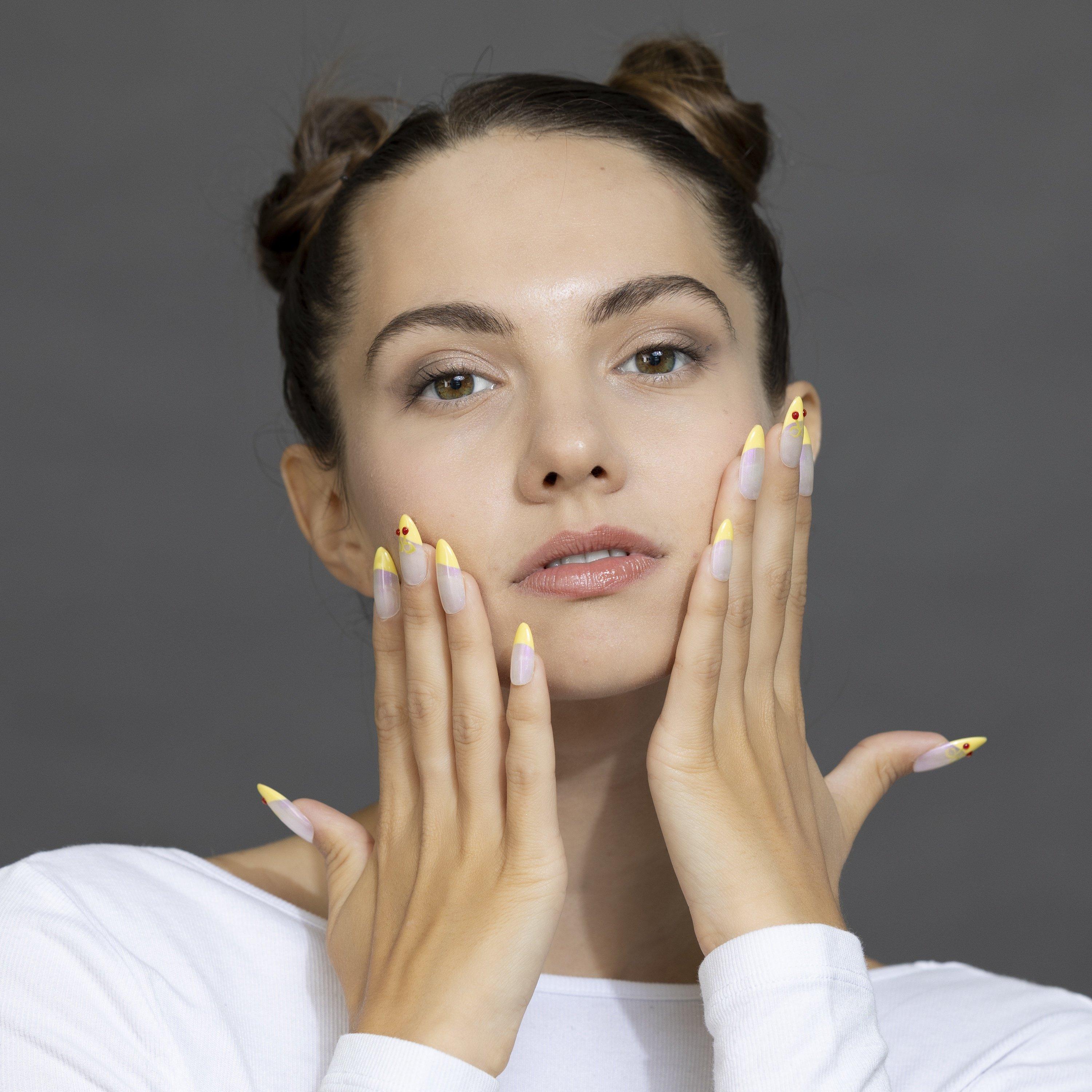 Vibrant yellow French-tip nails with a clean cherry design and subtle shimmer. A bold, playful look crafted from high-quality materials. Handmade and reusable for fresh, standout style.