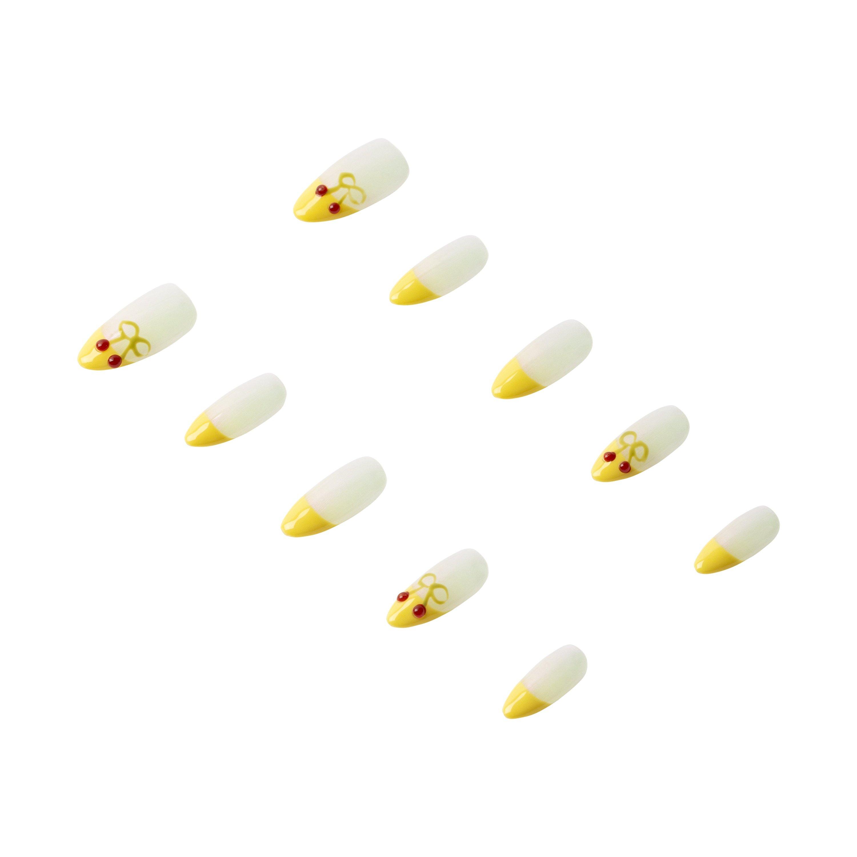 Vibrant yellow French-tip nails with a clean cherry design and subtle shimmer. A bold, playful look crafted from high-quality materials. Handmade and reusable for fresh, standout style.