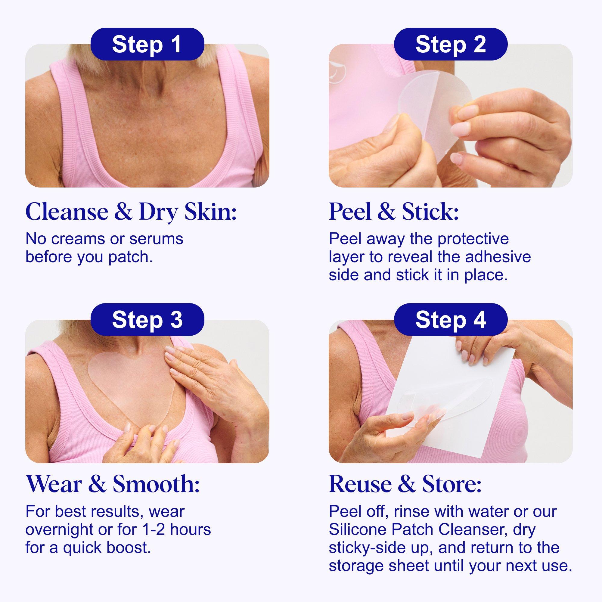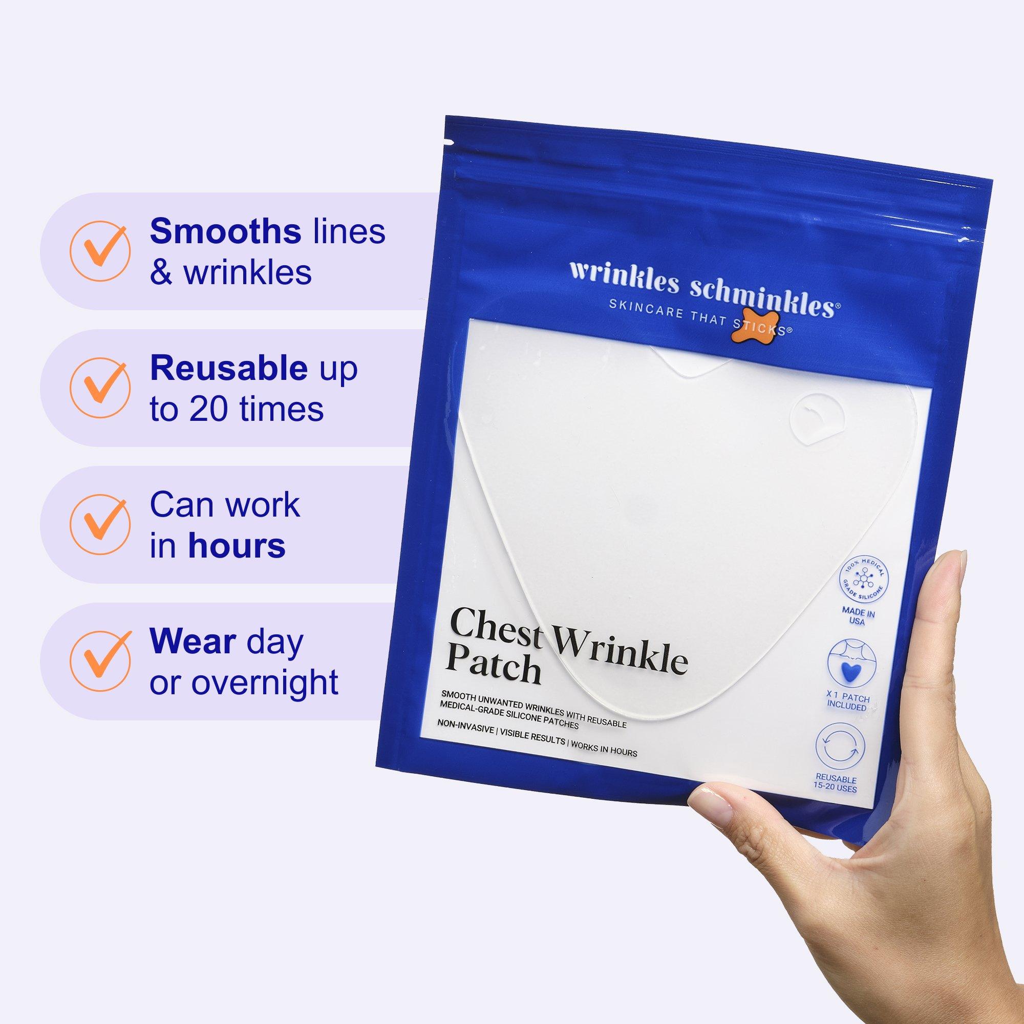 Wrinkles Schminkles Chest Wrinkle Patch uses 100% Medical-Grade Silicone to visibly smooth and hydrate chest and décolletage wrinkles. Designed to target signs of aging, sun damage, and side-sleeping overnight. Reusable, skin-safe, and effective.