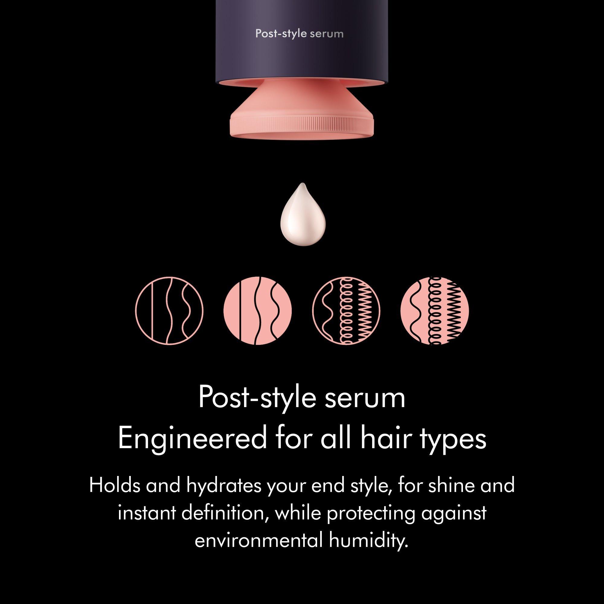This Dyson lightweight post-styling hair serum provides flexible, all day hold for smooth, shiny, frizz-free hair. Formulated for all hair types. ChitosanTM Post-styling hair serum is for use on dry and styled hair to define style.