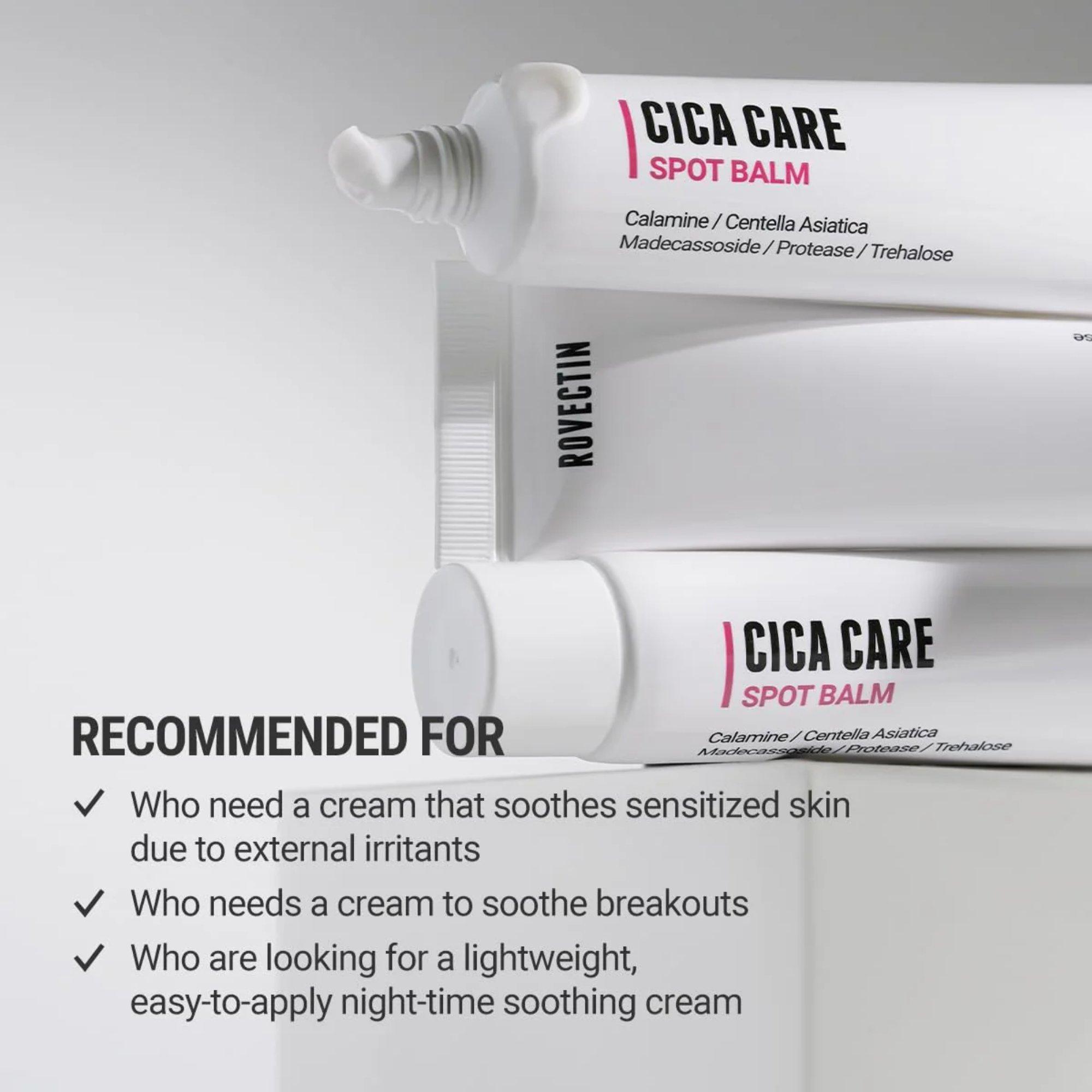 Rovectin Cica Care Spot Balm targets the most sensitive and irritated skin that has been damaged by hormonal breakouts, age, and rosacea.