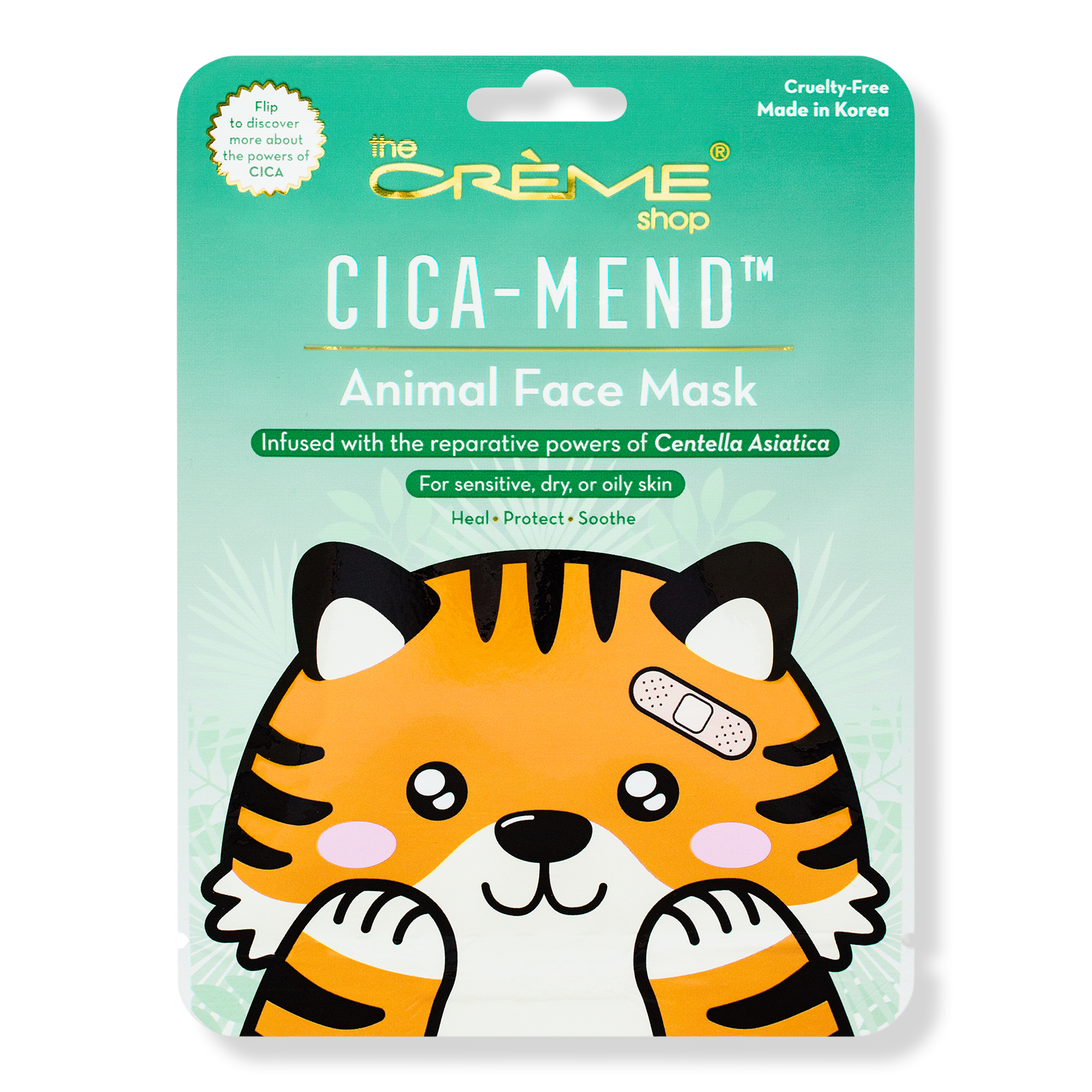 The Crème Shop's Cica-Mend - Animated Tiger Face Mask is infused with the reparative power of Centella Asiatica for sensitive, dry, or oily skin