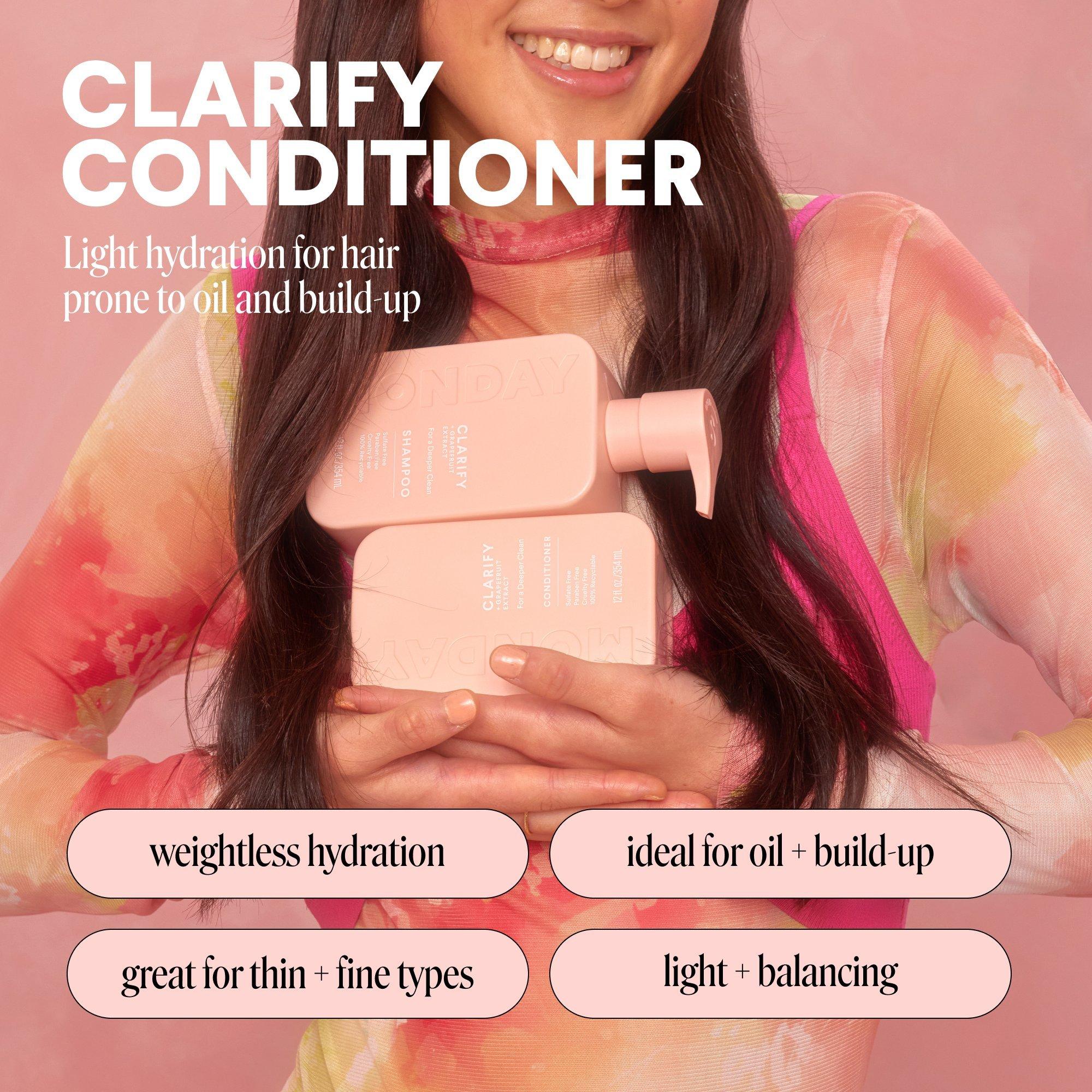 MONDAY Haircare's CLARIFY Conditioner incorporates active ingredients, antioxidant Grapefruit Extract and essential naturals such as Coconut Oil, Shea Butter and Ceramides to provide light hydration to oily hair prone to build-up - leaving it feeling refreshed and balanced.