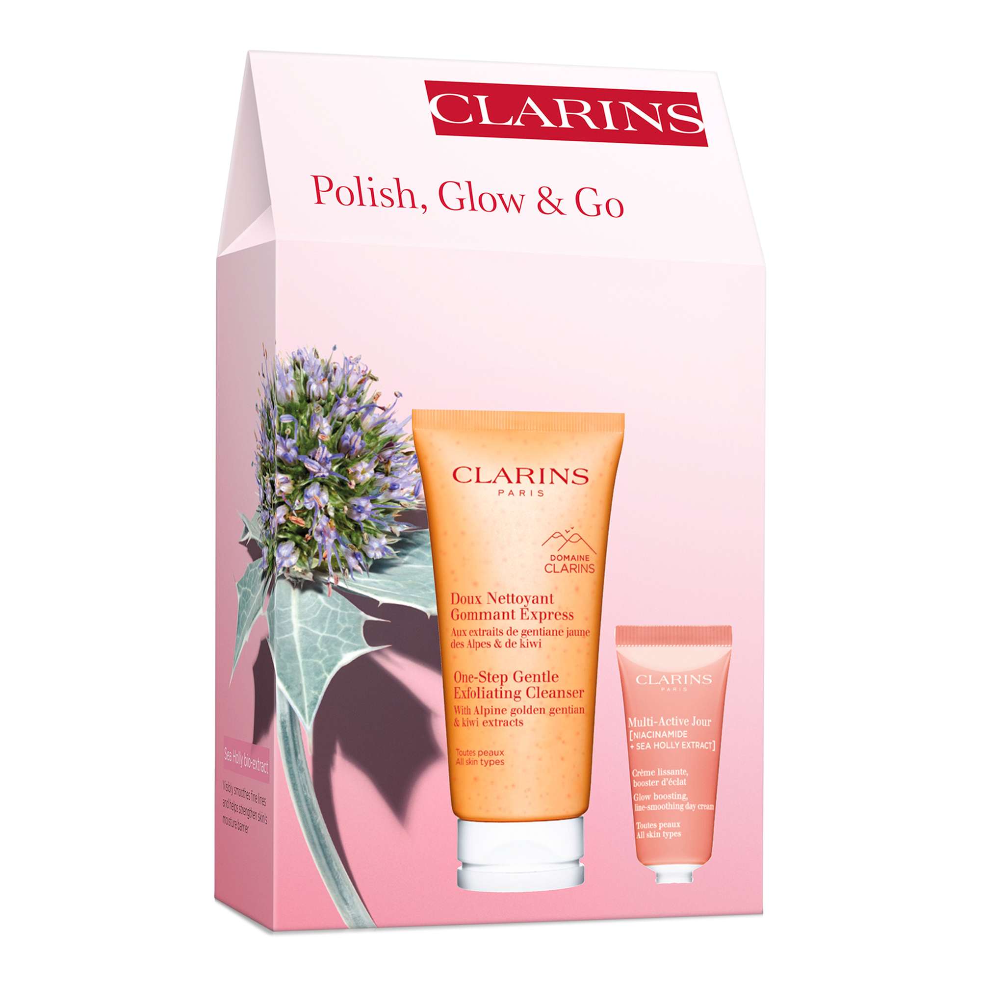 The Clarins Cleanse & Glow Travel Duo Gift Set is a 2-Piece travel set for clean, hydrated, radiant skin on-the-go.