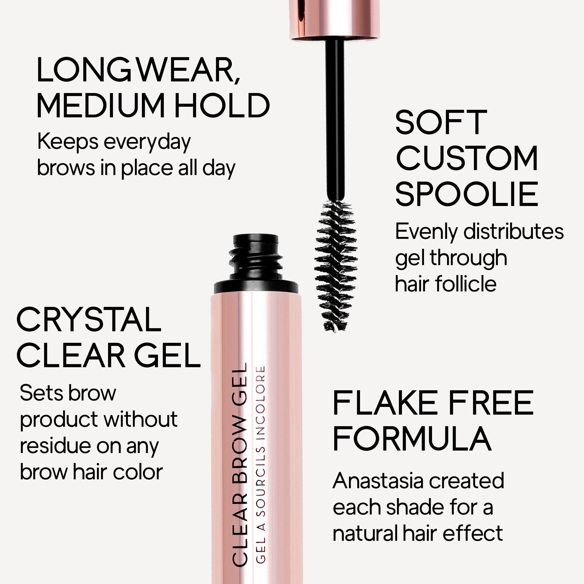 Clear Brow Gel by Anastasia Beverly Hills is a lightweight clear brow gel that sets color and holds brow hair in place for a clean, polished look that lasts.