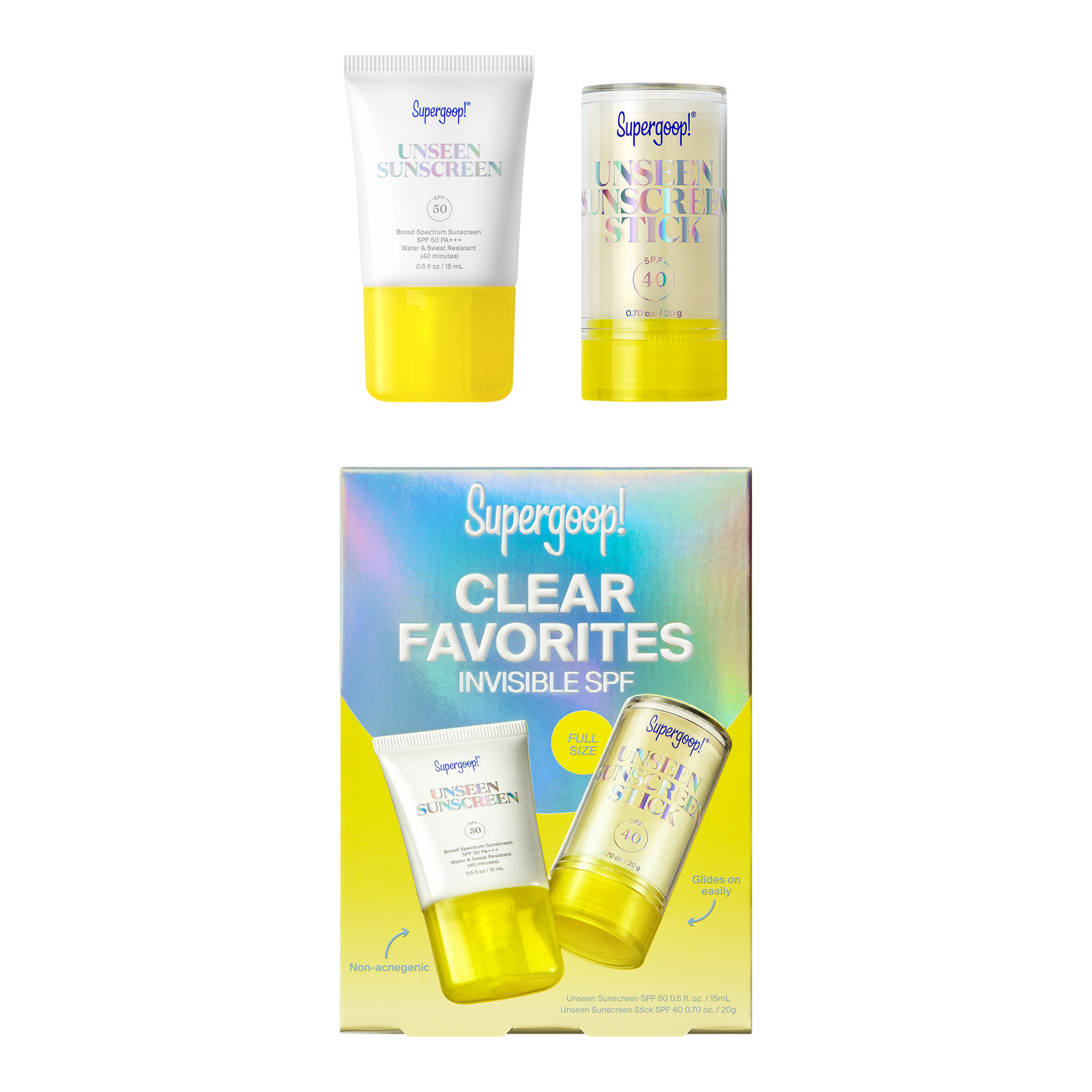 Supergoop! Clear Favorites Invisible SPF includes two 100% invisible SPF essentials for daily sun protection with no white cast.