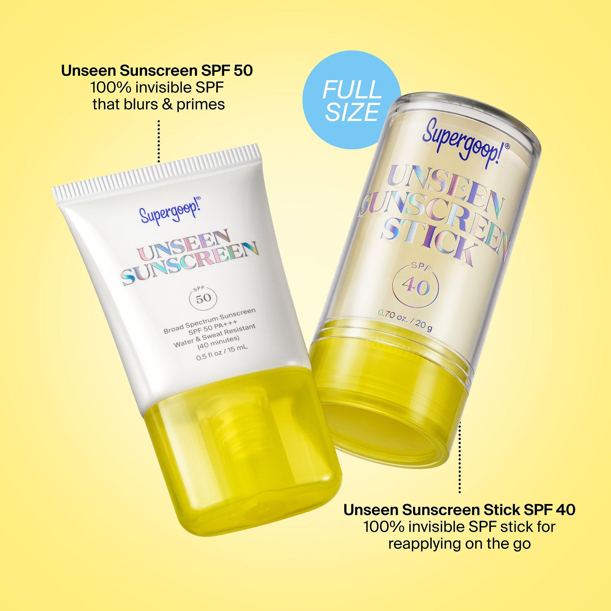 Unseen Sunscreen Stick SPF 40: Use Unseen Sunscreen Stick after your skincare routine, \& reapply throughout the day as needed. Remove the cap \& discard the clear plastic disc on the top of the stick. Twist the bottom of the pack to expose the sunscreen stick. Swipe Unseen Sunscreen Stick generously \& evenly across your face \& body.