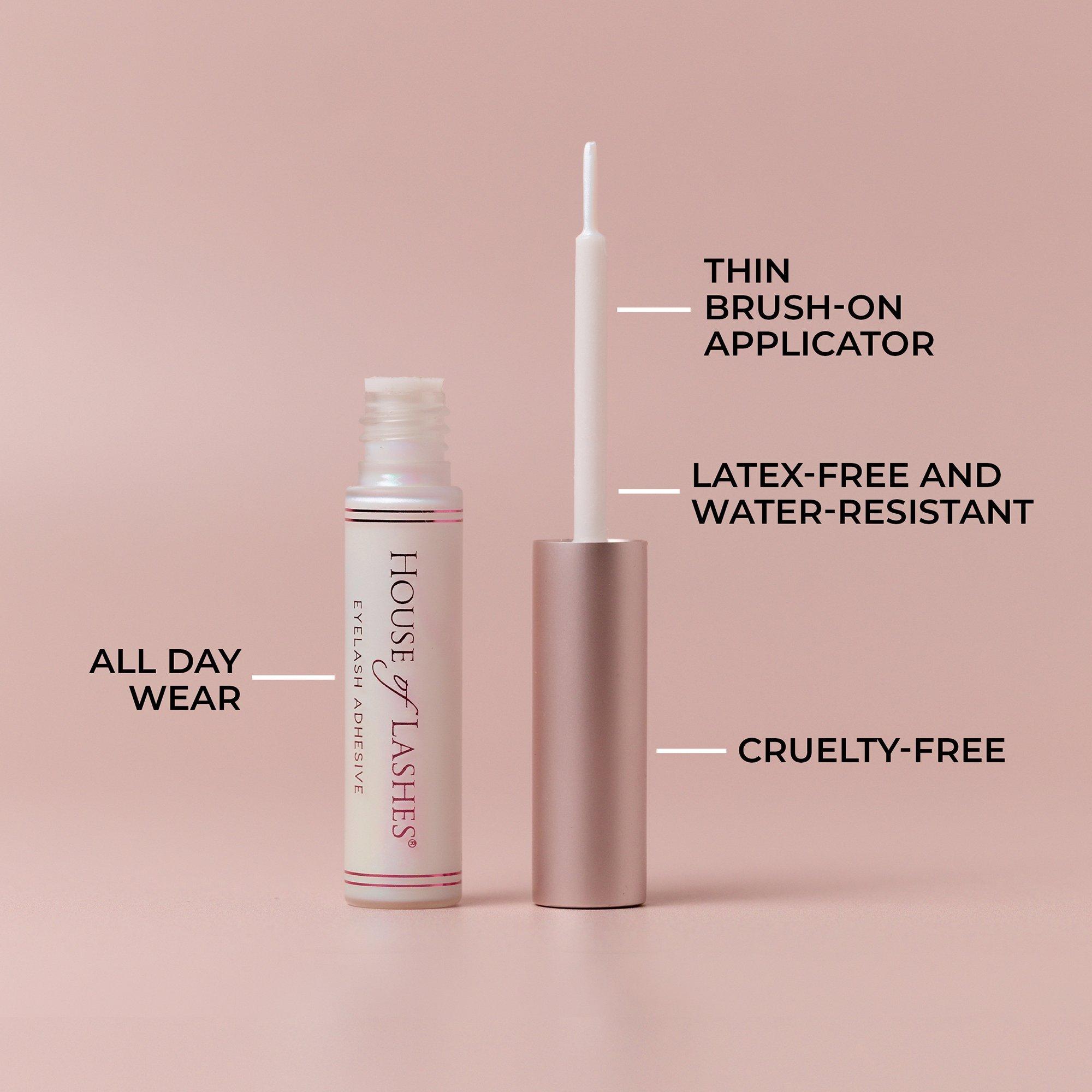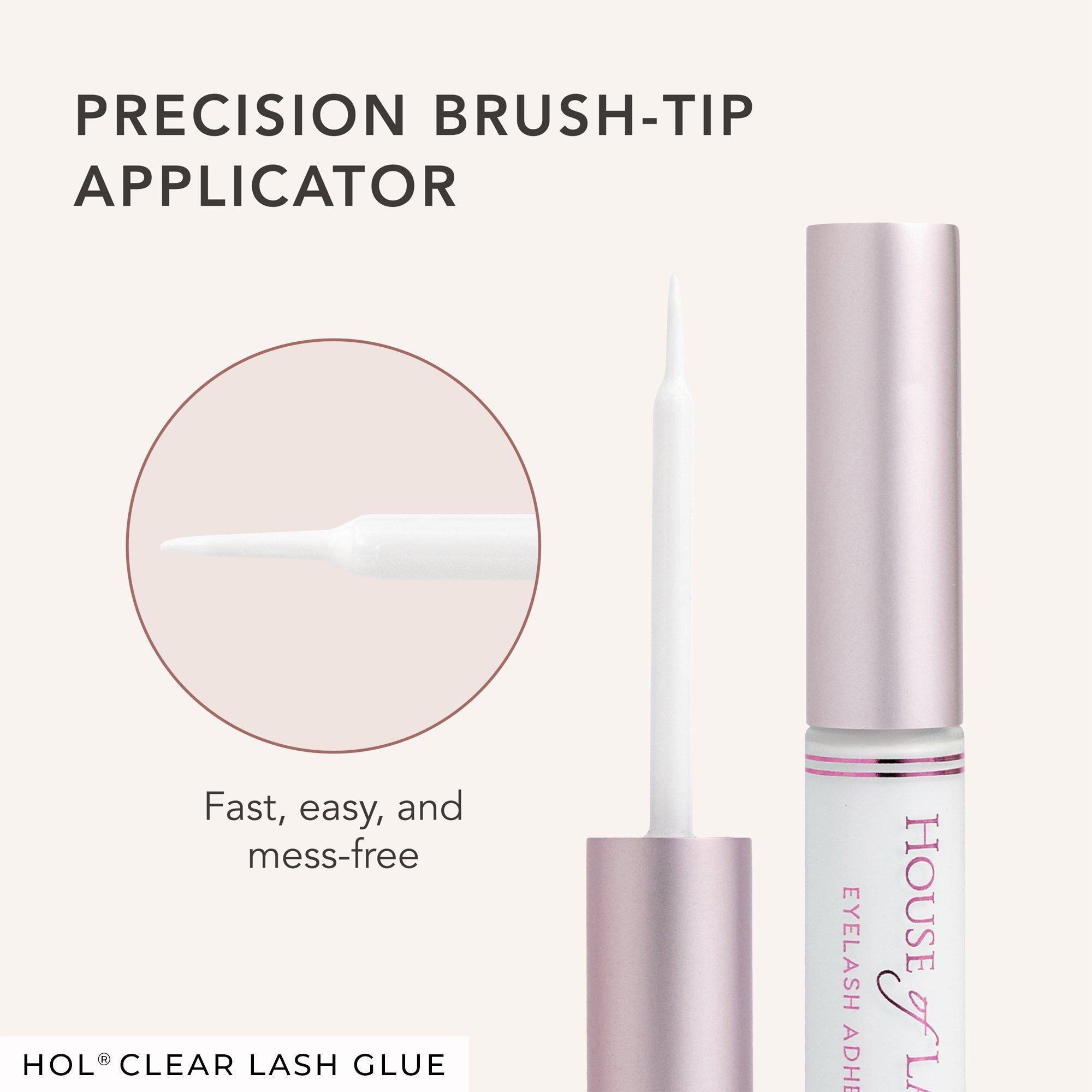 House of Lashes' Clear Latex-Free Waterproof Eyelash Glue delivers 24-hour long wear with a brush-on applicator for precise, mess-free application. Applies white and dries clear for a seamless blend.