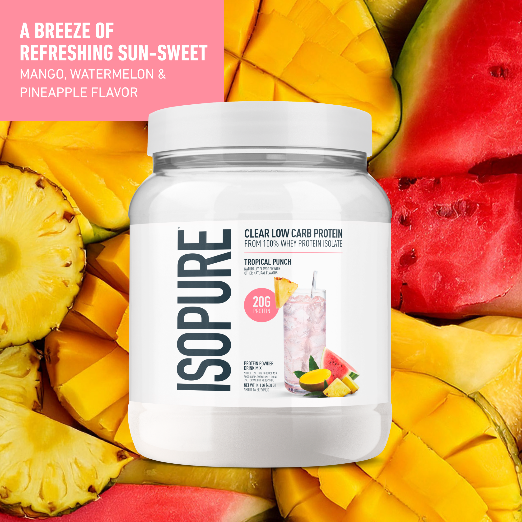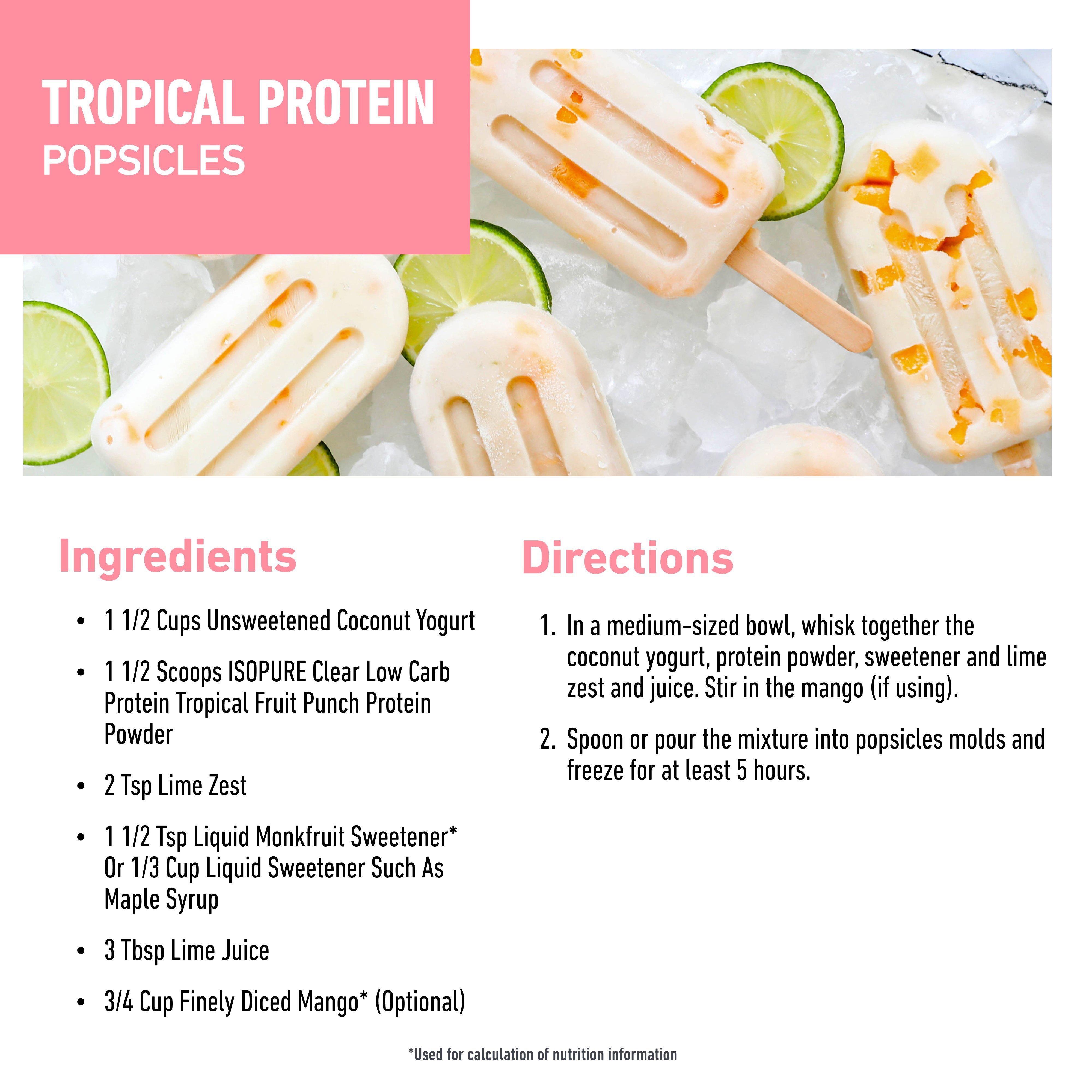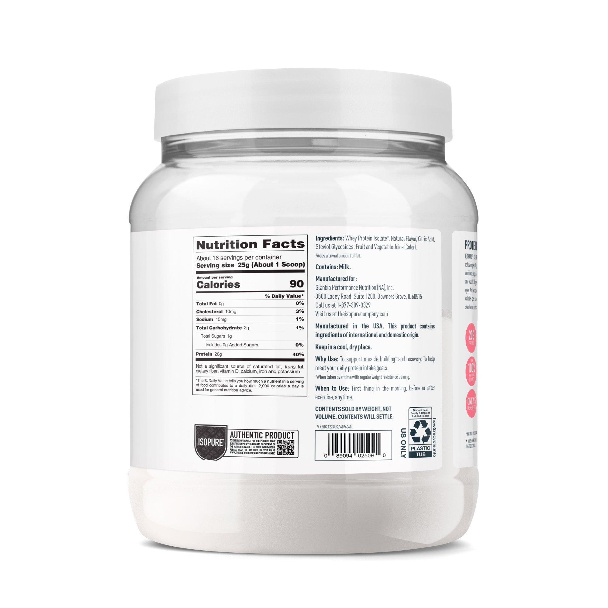 ISOPURE Clear Low Carb Protein enhances water with refreshing, fruity flavors and 20g of ultra-filtered protein in every serving. Made with 100% whey protein isolate for exceptional purity, no artificial sweeteners or flavors, no added sugar, and only 5 total ingredients.