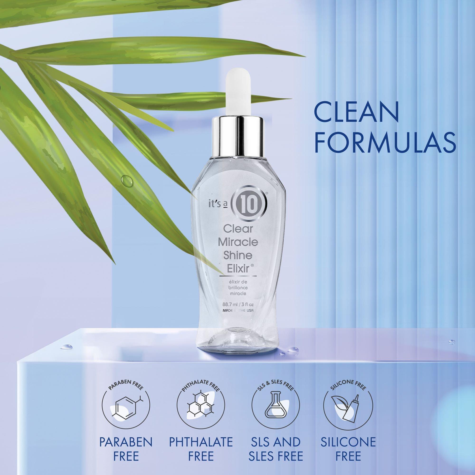 It's a 10 Clear Miracle Shine Elixir proves that it's possible to have explosively shiny hair that comes from plant-derived ingredients. It's a 10 Clear Miracle Shine Elixir is formulated to be incredibly lightweight and sheer. Use on dry hair and watch your natural beauty shine through.