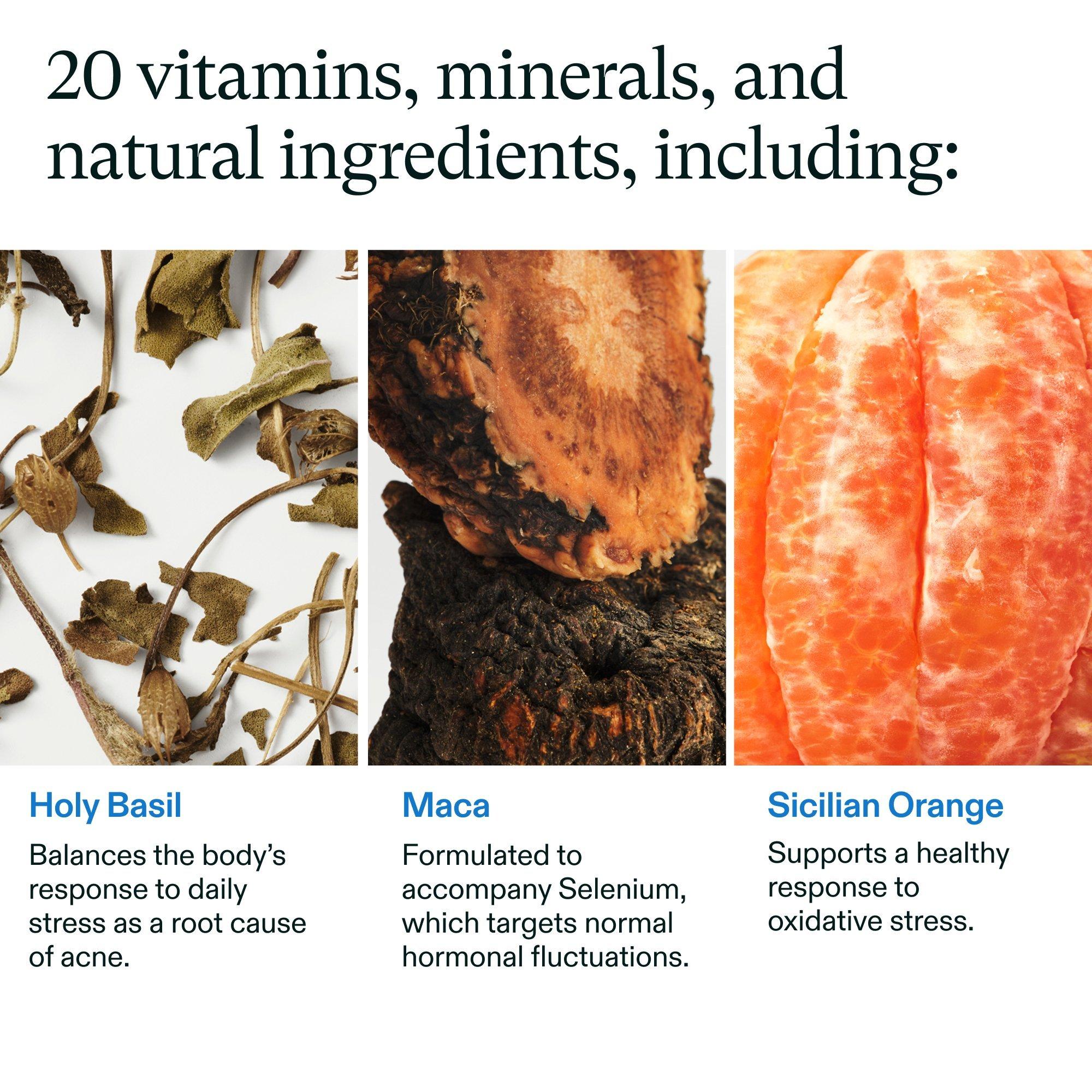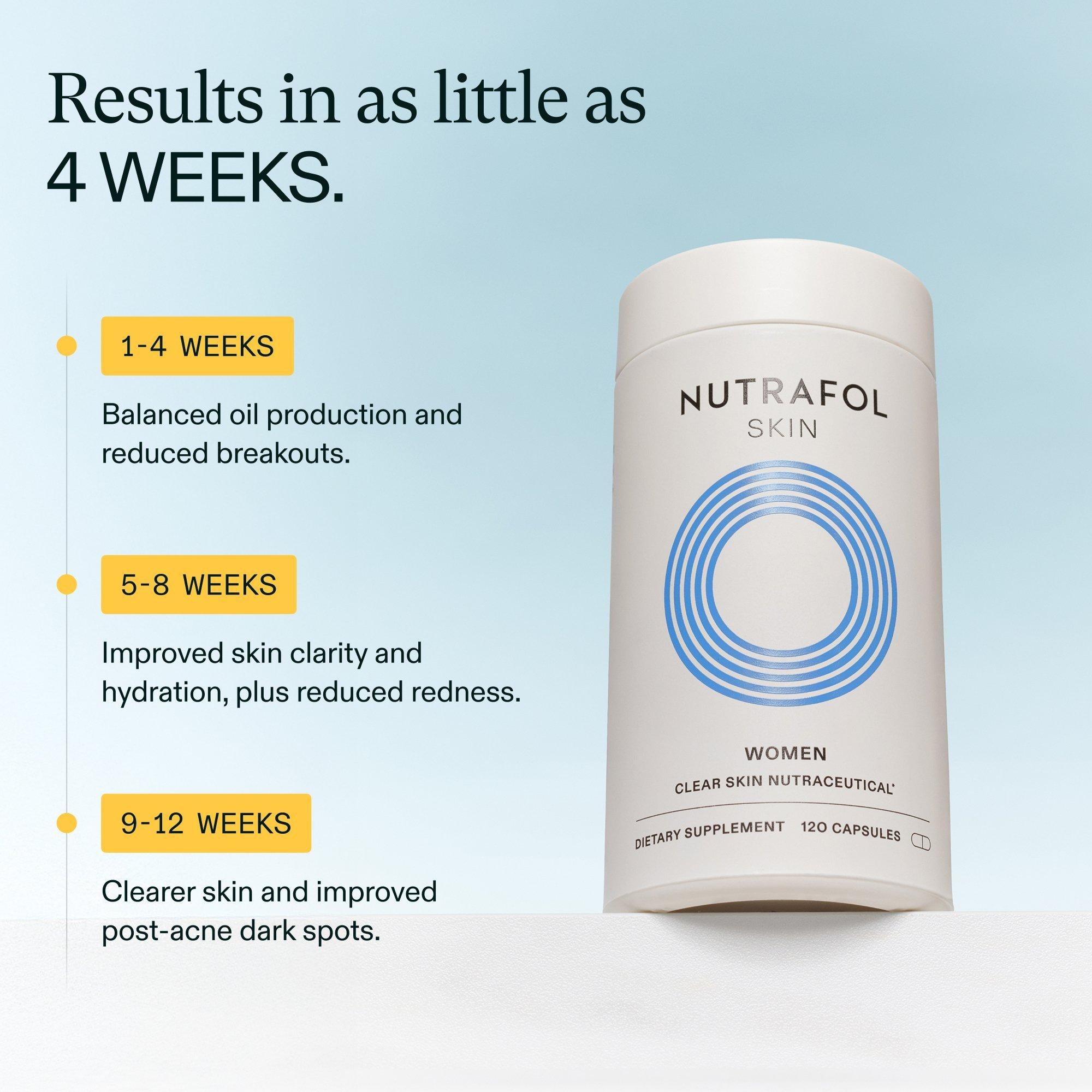 Nutrafol Clear Skin Clinically Proven Supplement is a once-daily skin supplement to address breakouts, blackheads, dark spots, redness, and skin texture all at once. Physician-formulated with ingredients to target key causes of acne so you can see clearer, smoother skin in as little as 4-12 wk (1)*