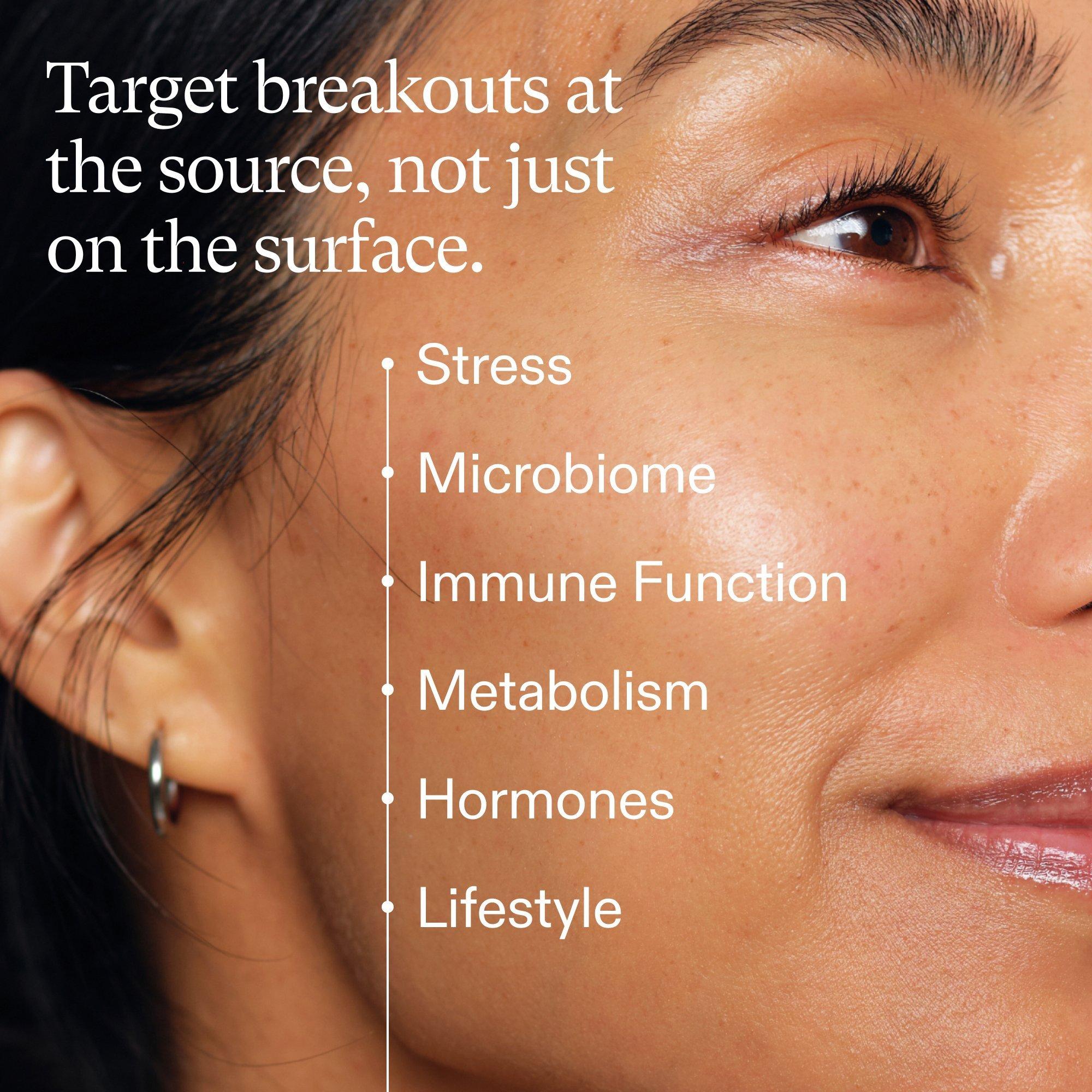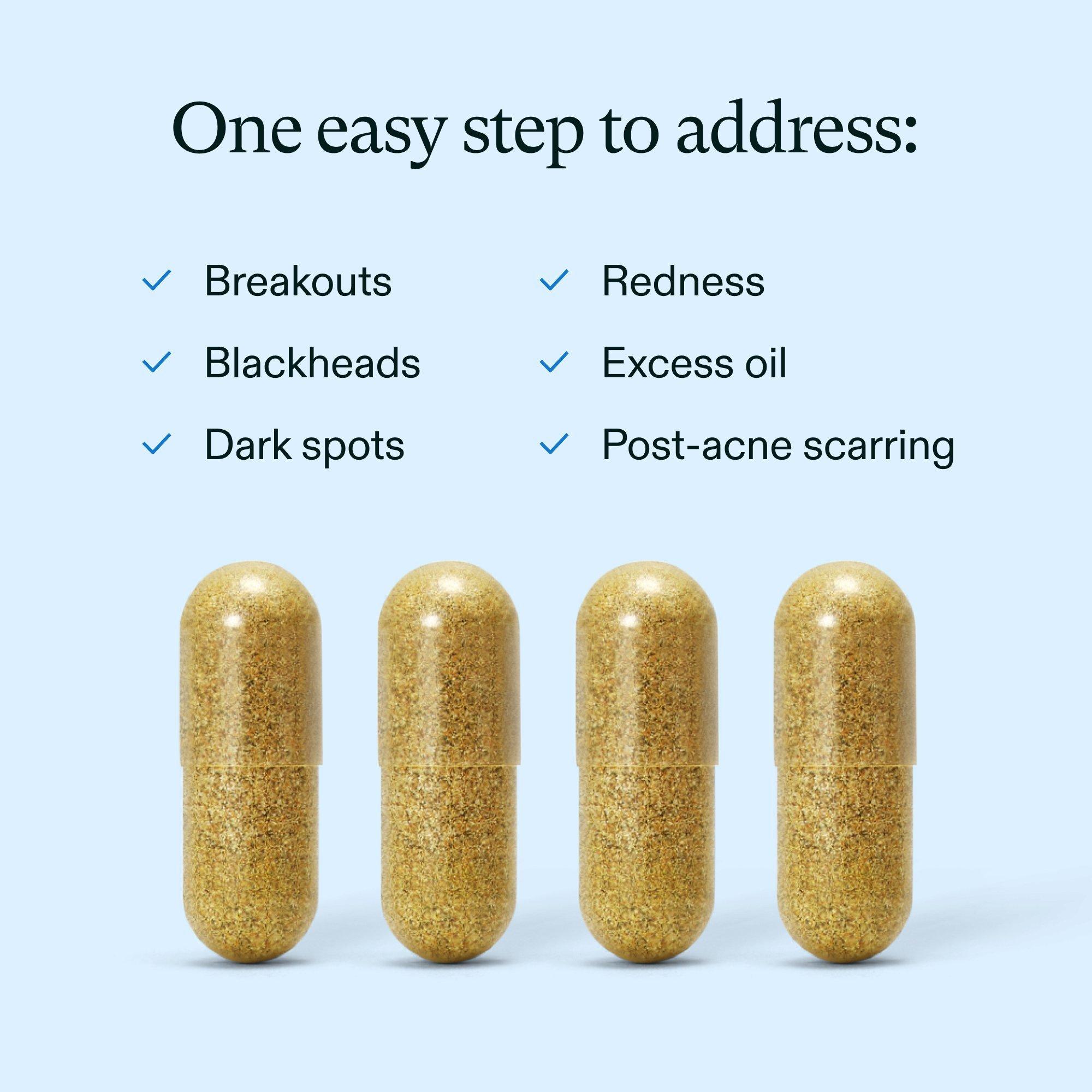 Nutrafol Clear Skin Clinically Proven Supplement is a once-daily skin supplement to address breakouts, blackheads, dark spots, redness, and skin texture all at once. Physician-formulated with ingredients to target key causes of acne so you can see clearer, smoother skin in as little as 4-12 wk (1)*