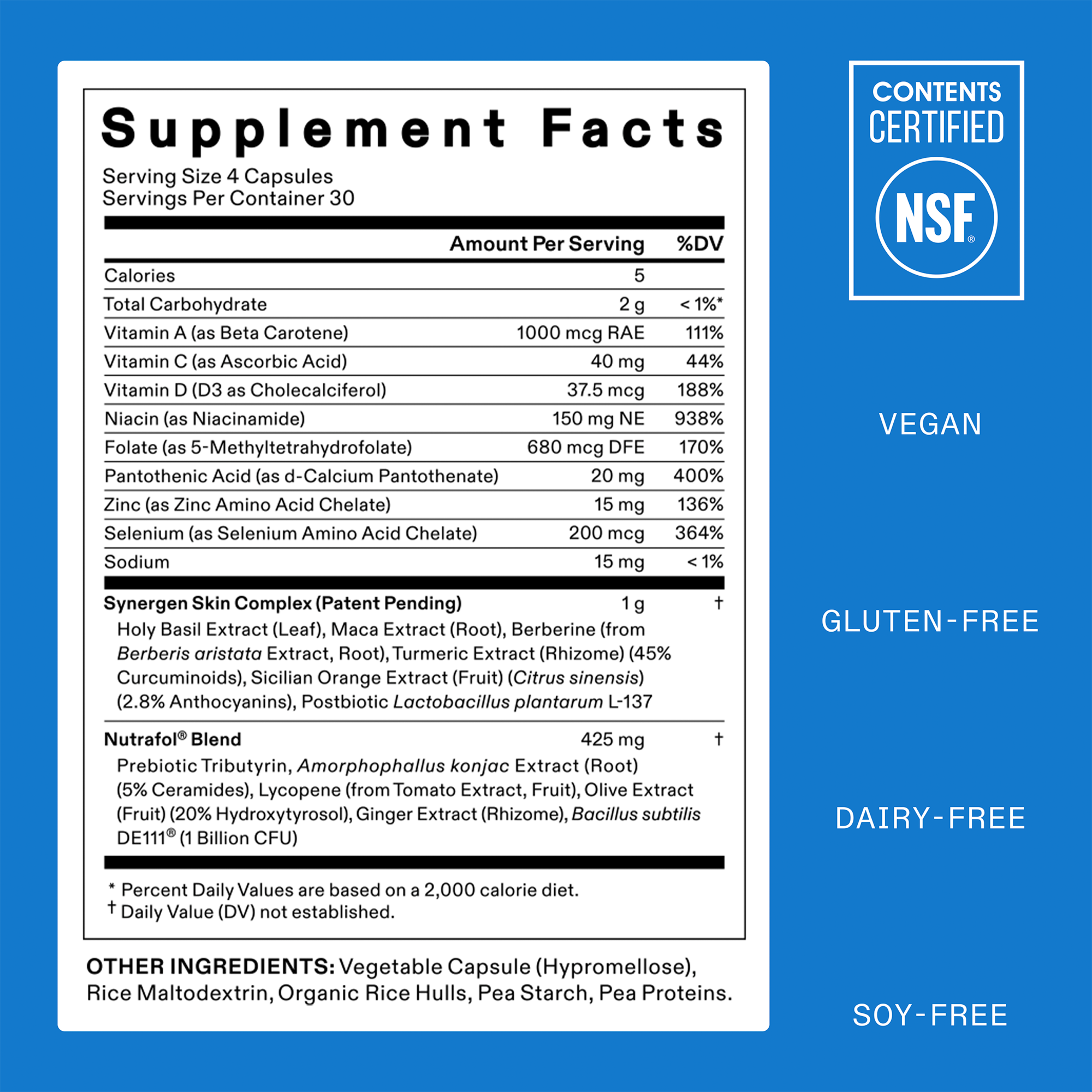 SYNERGEN SKIN COMPLEX (Patent Pending): Holy Basil Extract (Leaf), Maca Extract (Root), Berberine (from Berberis aristata Extract, Root), Turmeric Extract (Rhizome) (45% Curcuminoids), Sicilian Orange Extract (Fruit) (Citrus sinensis) (2.8% Anthocyanins), Postbiotic Lactobacillus plantarum L-137; NUTRAFOL® BLEND: Prebiotic Tributyrin, Amorphophallus konjac Extract (Root) (5% Ceramides), Lycopene (from Tomato Extract, Fruit), Olive Extract (Fruit) (20% Hydroxytyrosol), Ginger Extract (Rhizome), Bacillus subtilis DE111® (1 Billion CFU); Vitamin A (as Beta-Carotene), Vitamin C (as Ascorbic Acid), Vitamin D (D3 as Cholecalciferol), Niacin (as Niacinamide), Folate (as 5-Methyltetrahydrofolate), Pantothenic Acid (as d-Calcium Pantothenate), Zinc (as Zinc Amino Acid Chelate), Selenium (as Selenium Amino Acid Chelate); Other Ingredients: Vegetable Capsule (Hypromellose), Rice Maltodextrin, Organic Rice Hulls, Pea Starch, Pea Proteins.