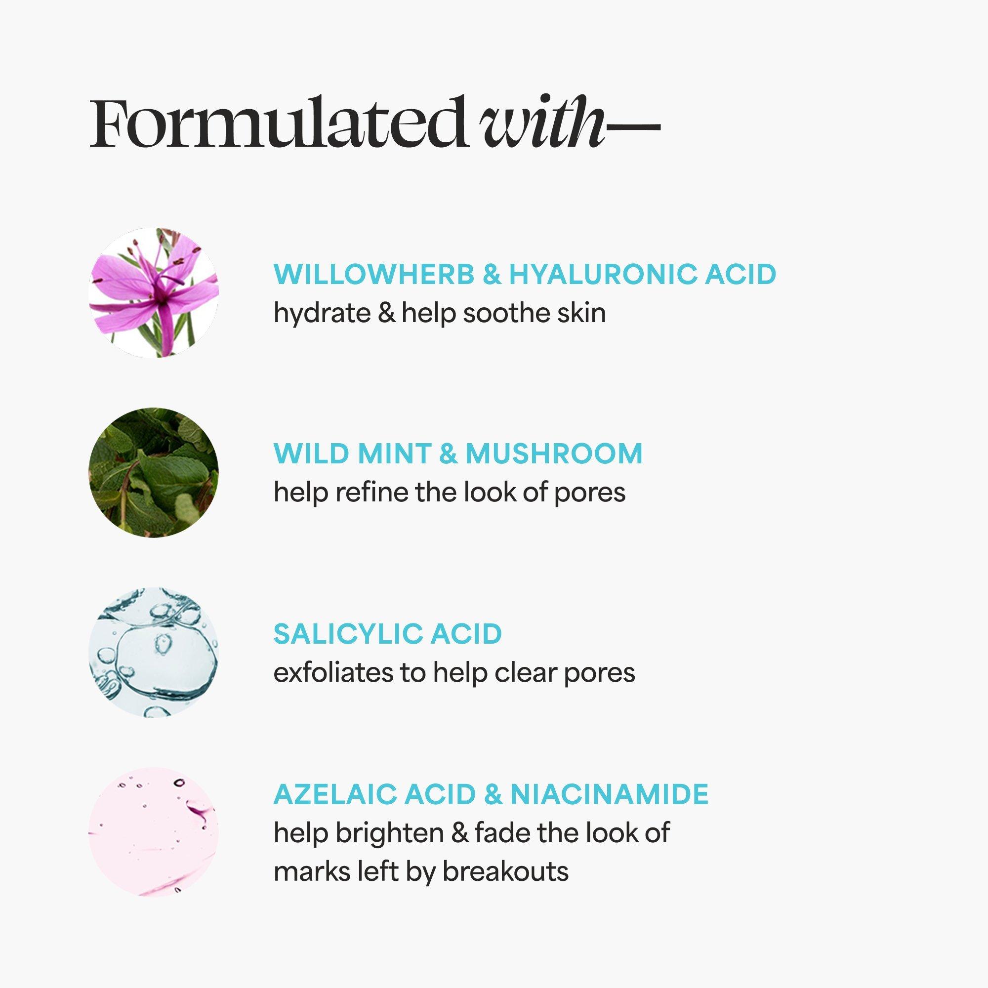 • Azelaic Acid & Niacinamide: help brighten & fade the look of marks left by breakouts
