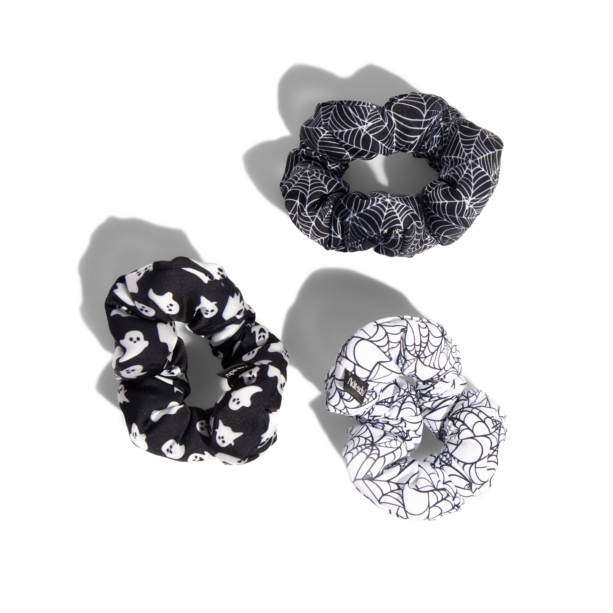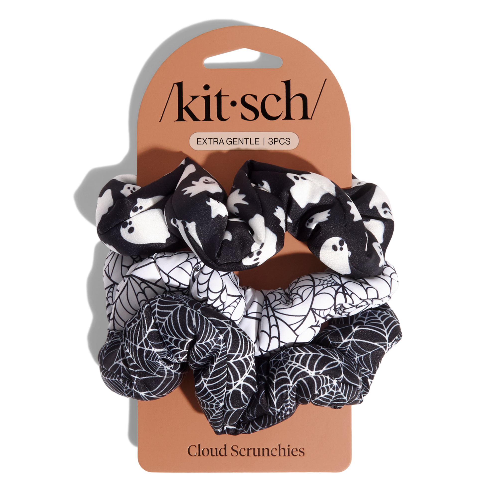 Top off your spooky-season look with the Kitsch Recycled Fabric Cloud Scrunchies. This 3-piece set features ghost prints, spiderwebs, and classic black for the perfect mix of cute, creepy, and comfy—all made from recycled fabric.