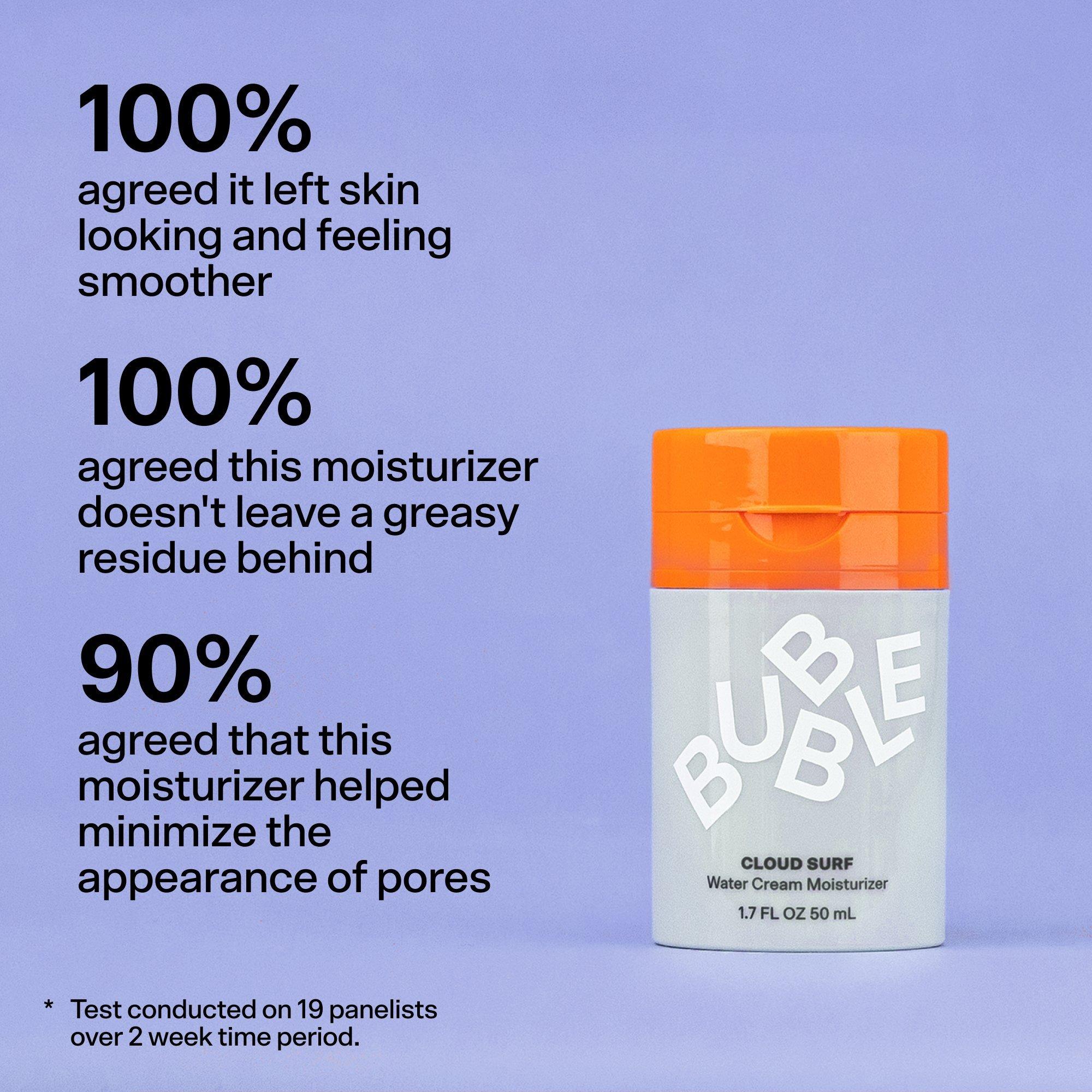 Bubble's Cloud Surf is a light-as-air water cream moisturizer quenches & rebalances normal-to-combo skin without feeling sticky or heavy. Its floofy perfection minimizes the appearance of pores, helps rebalance oils, leaves skin looking smooth, nourished, and oh-so-natural, even under makeup