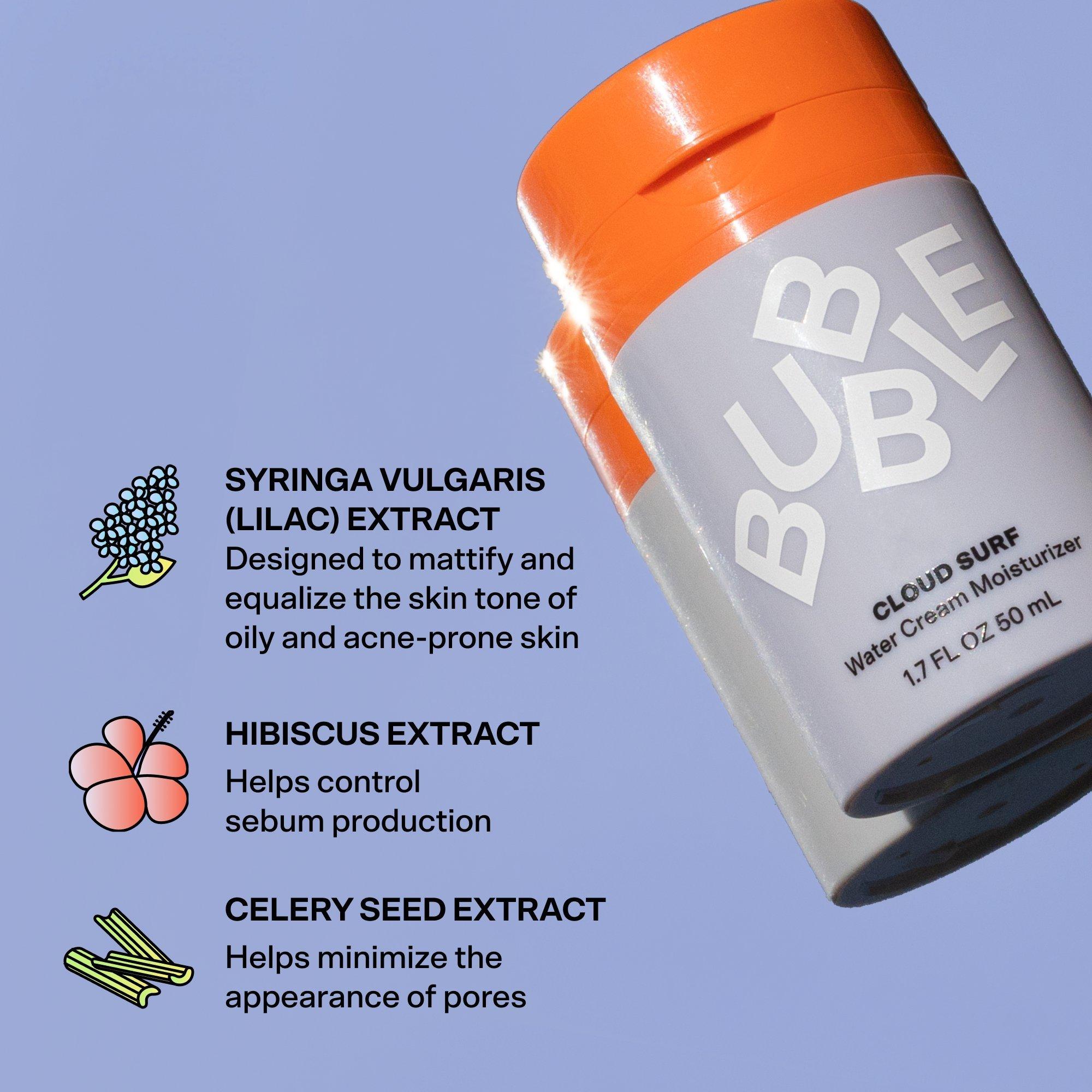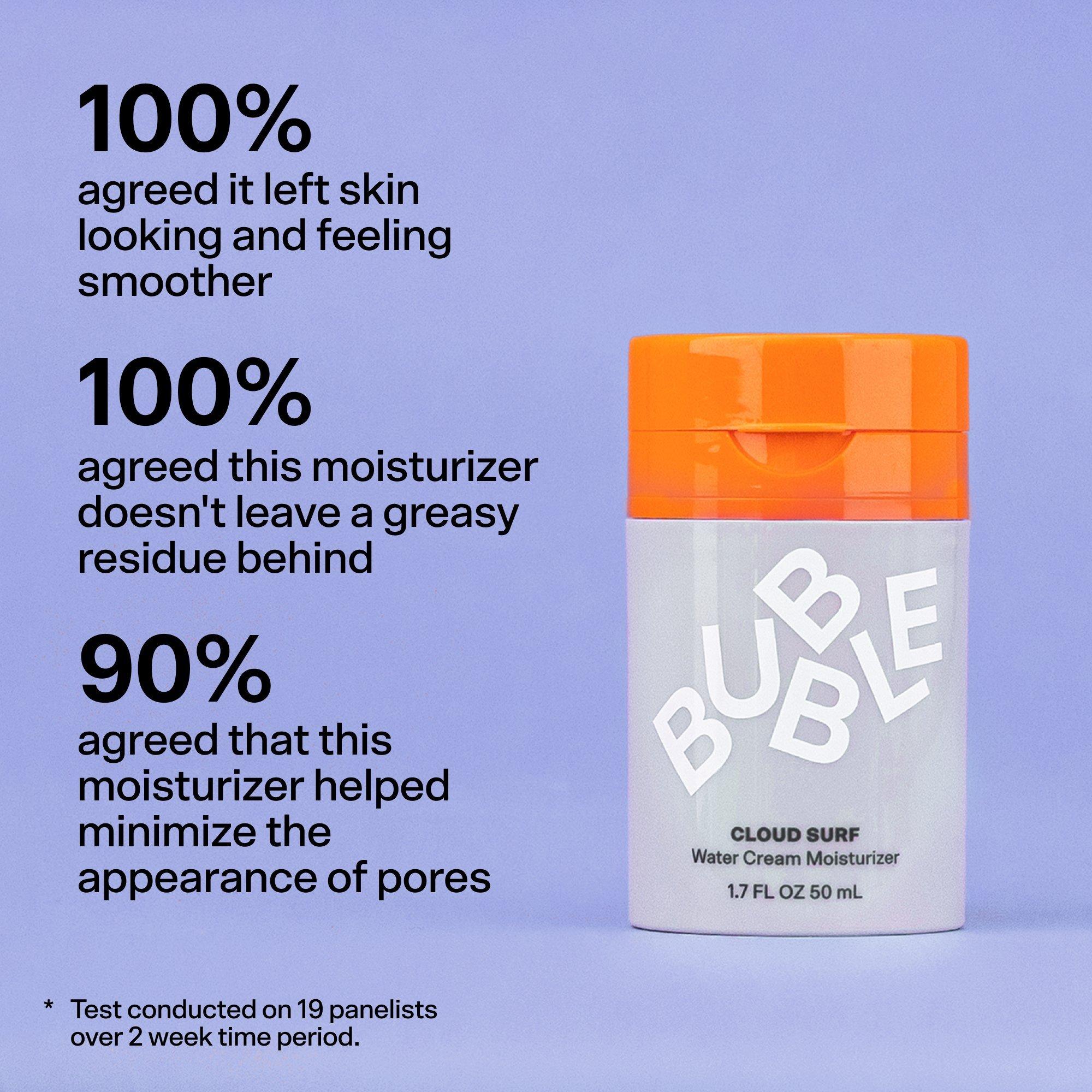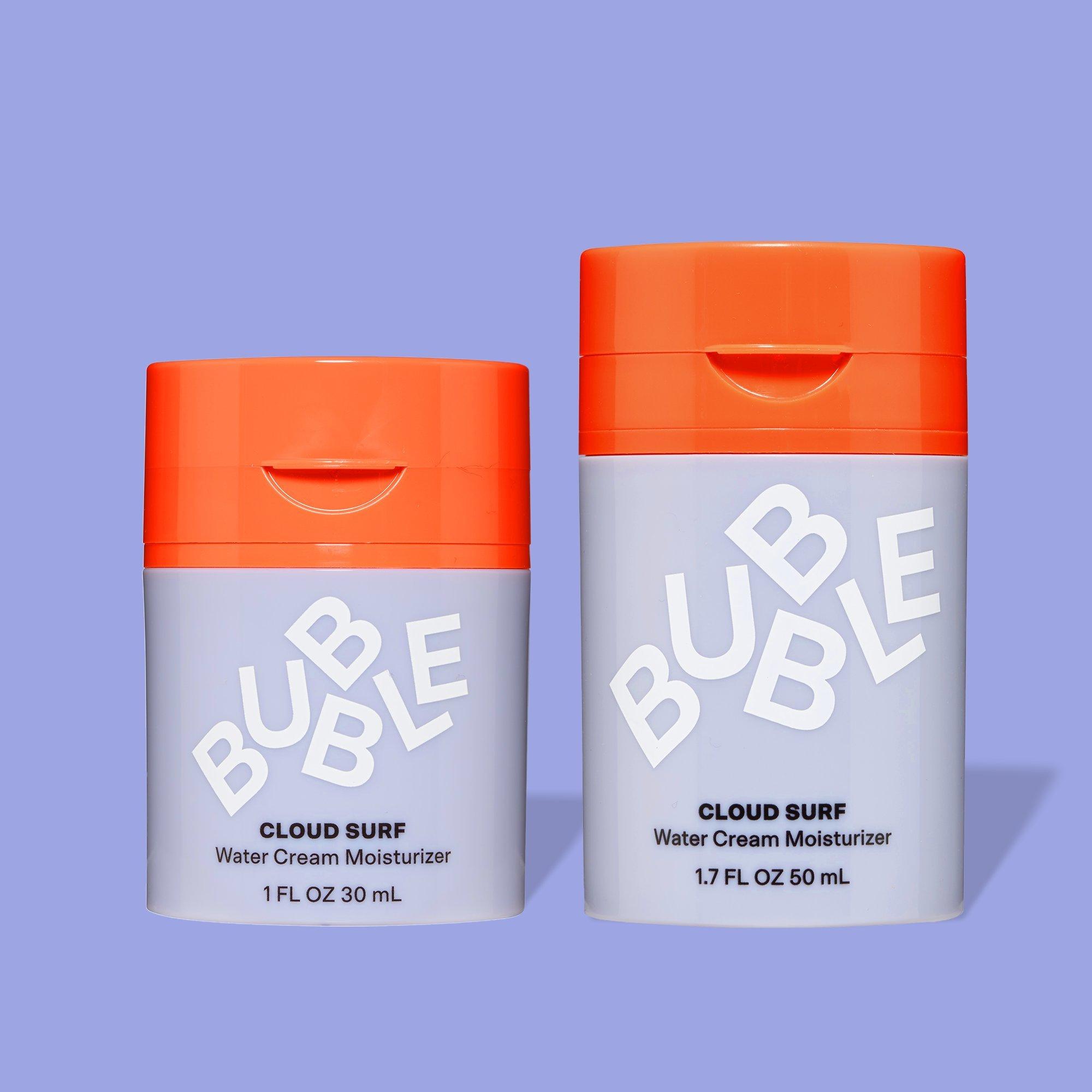Bubble's Cloud Surf is a light-as-air water cream moisturizer quenches & rebalances normal-to-combo skin without feeling sticky or heavy. Its floofy perfection minimizes the appearance of pores, helps rebalance oils, leaves skin looking smooth, nourished, and oh-so-natural, even under makeup