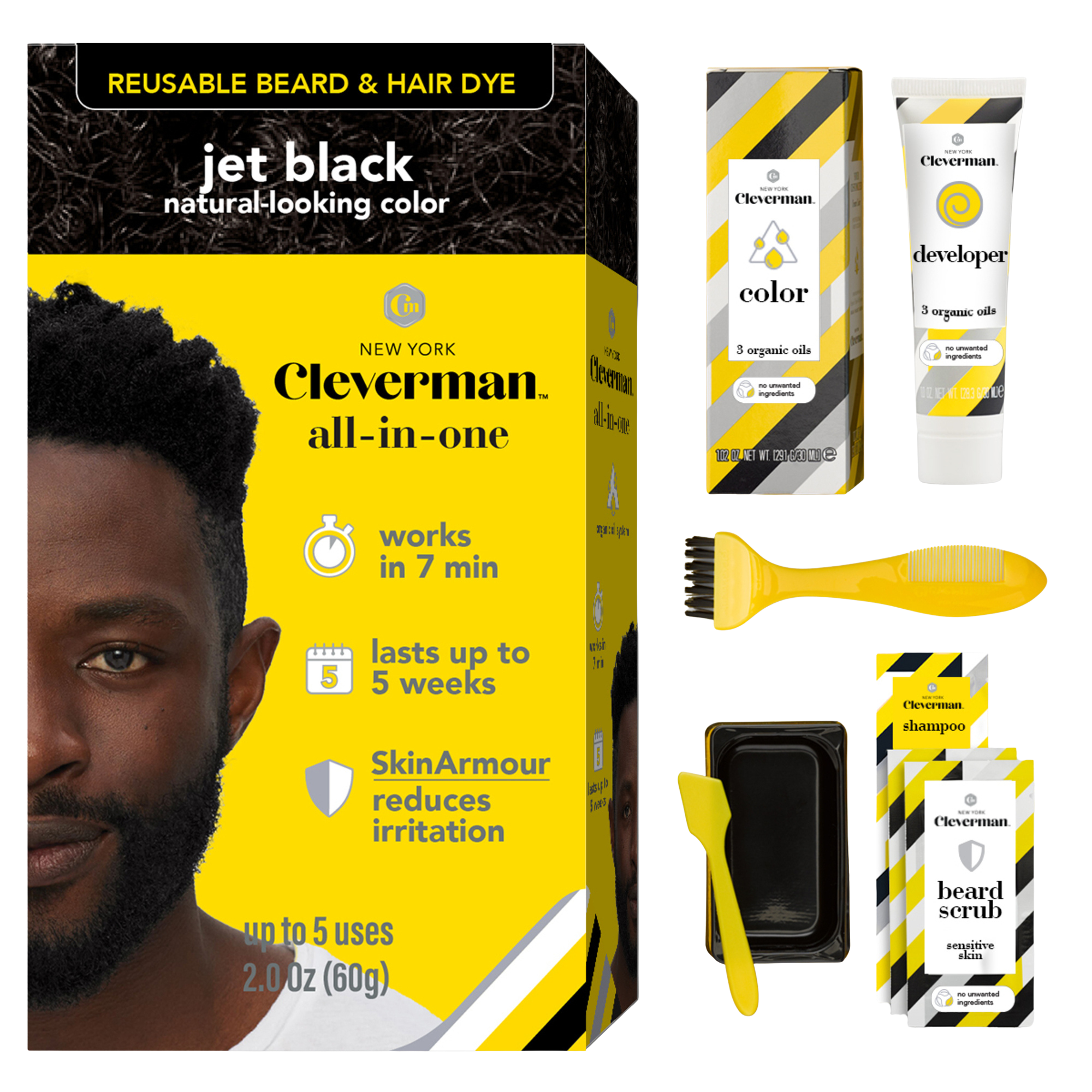 All-in-one hair & beard dye kit for natural-looking gray coverage on hair, beard, and mustache. Fast 7-minute results, lasts up to 5 weeks. Ammonia-free, vegan formula with nourishing oils. Easy to use and reusable, with up to 5 applications per kit (2.0 Oz).