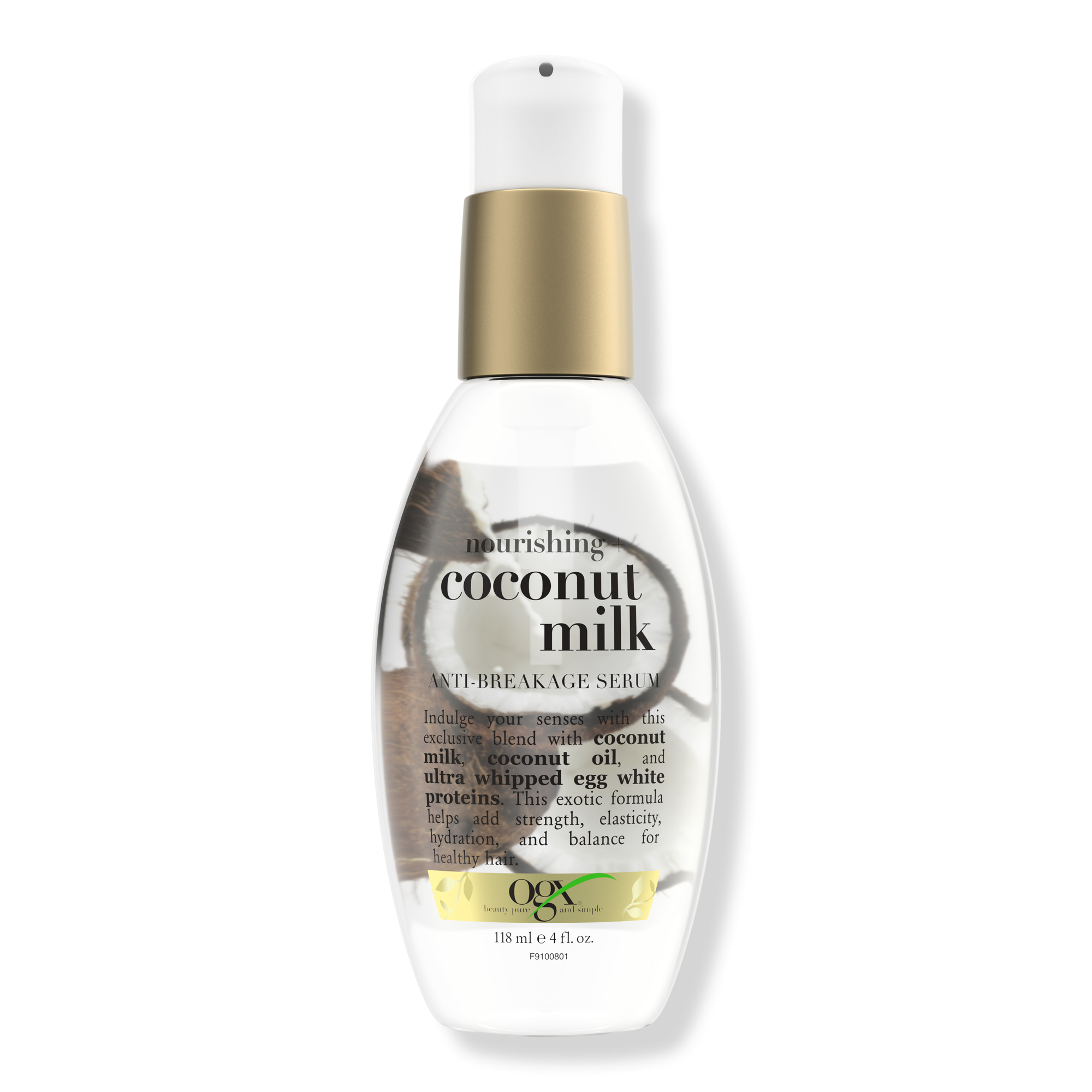 Strengthen & hydrate hair without weighing it down with OGX Nourishing + Coconut Milk Anti-Breakage Hair Serum . A tantalizing blend with coconut milk, coconut oil & egg white protein works to repair strands.