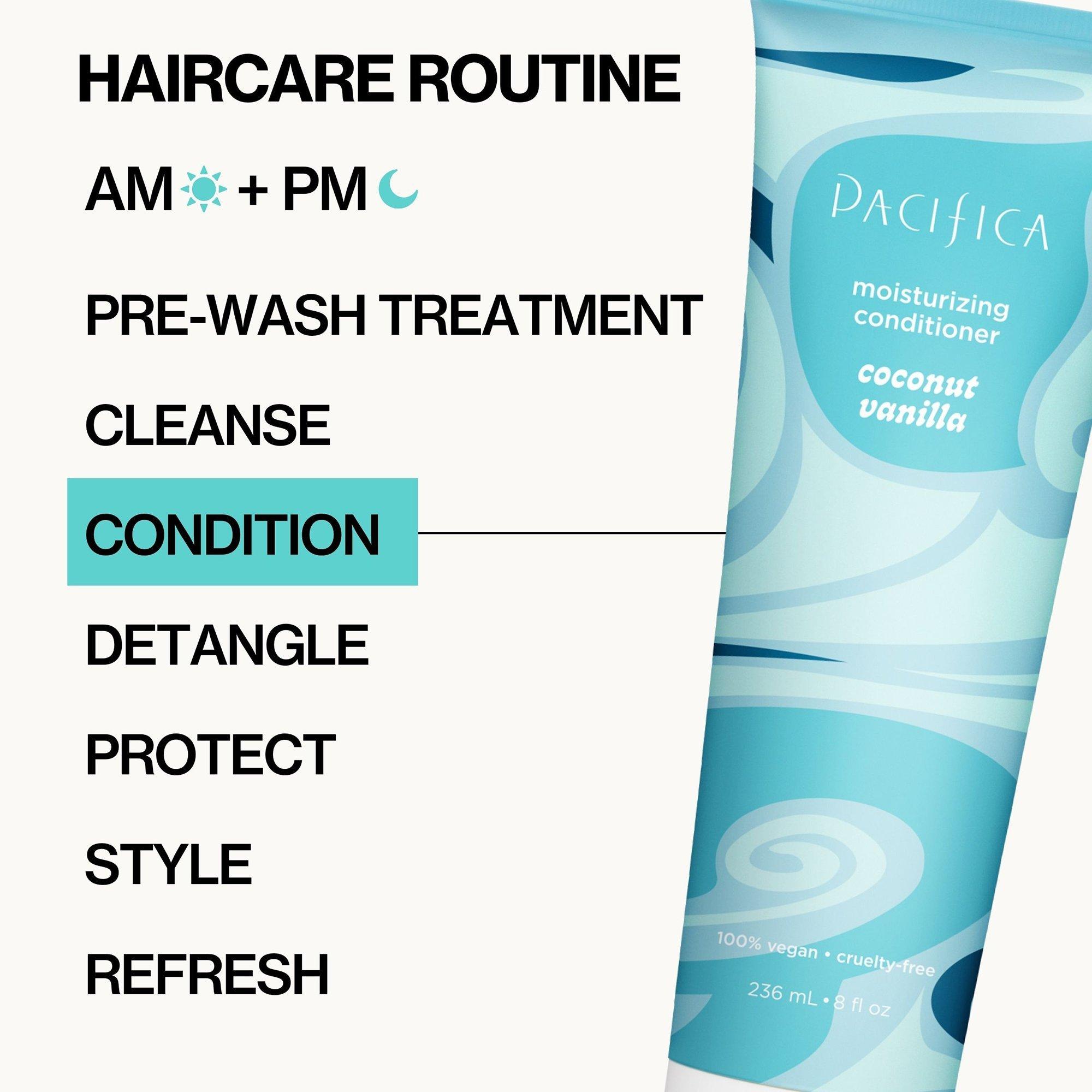 Pacifica's Coconut Vanilla Moisturizing Conditioner deep conditions, helps repair and adds softness while leaving your hair smelling fresh and and like a coconut vacation.