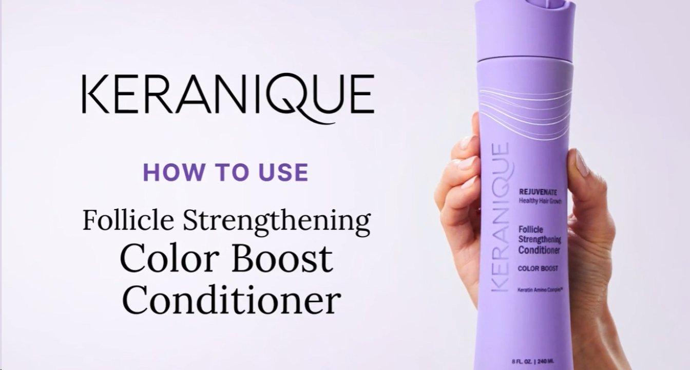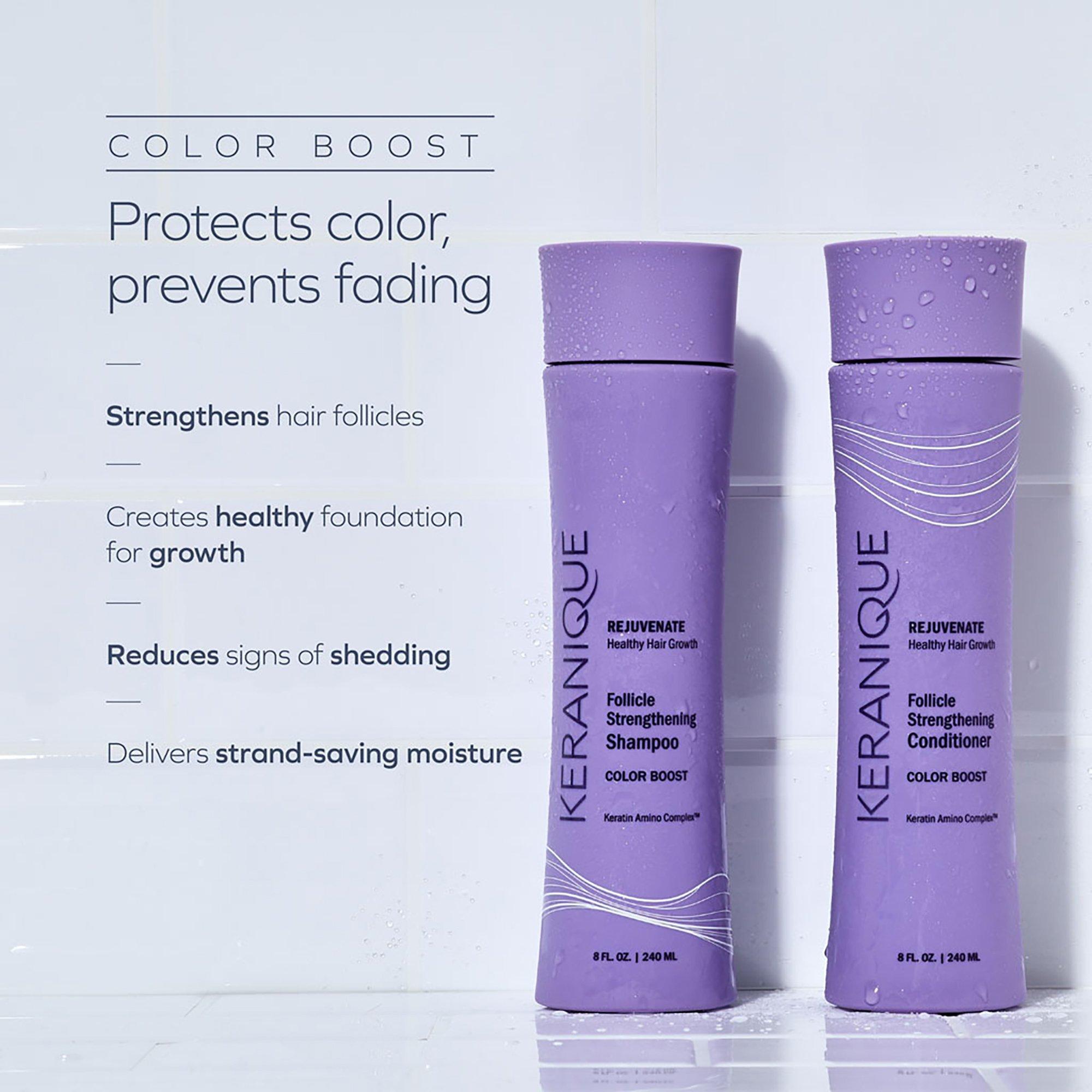 Keranique's Color Boost Follicle Strengthening Conditioner is scientifically formulated to deliver strand-saving protection and expert care for color-treated hair. It features True Tone Technology which helps reduce color loss from after-process washing and protects against color fade.