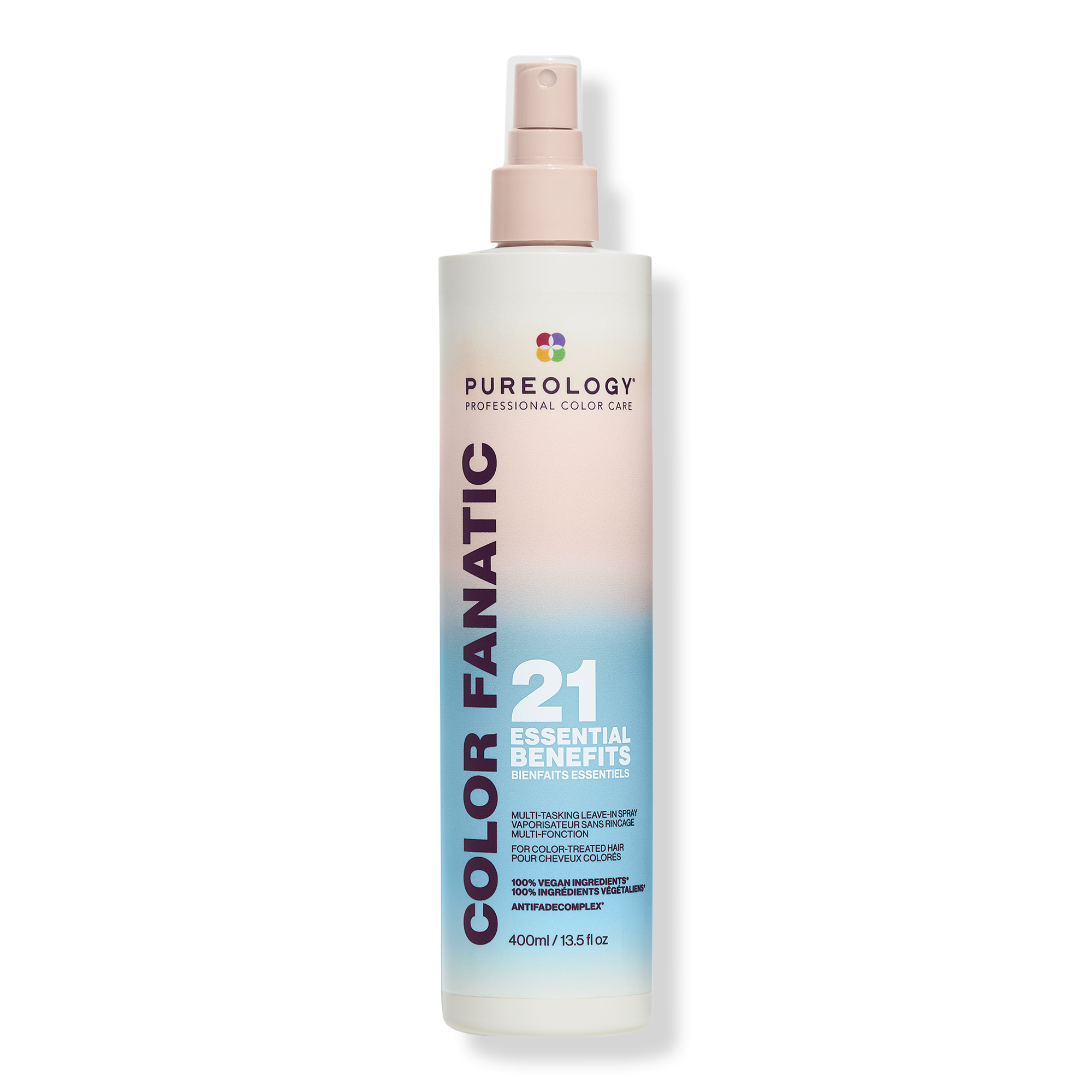 Pureology Color Fanatic Multi-Tasking Leave-In Conditioner is an anti-frizz detangler spray that primes, preserves color vibrancy, protects from heat damage up to 450° F, and adds hair shine from root to tip. This leave in treatment is suitable for both natural and color treated hair.