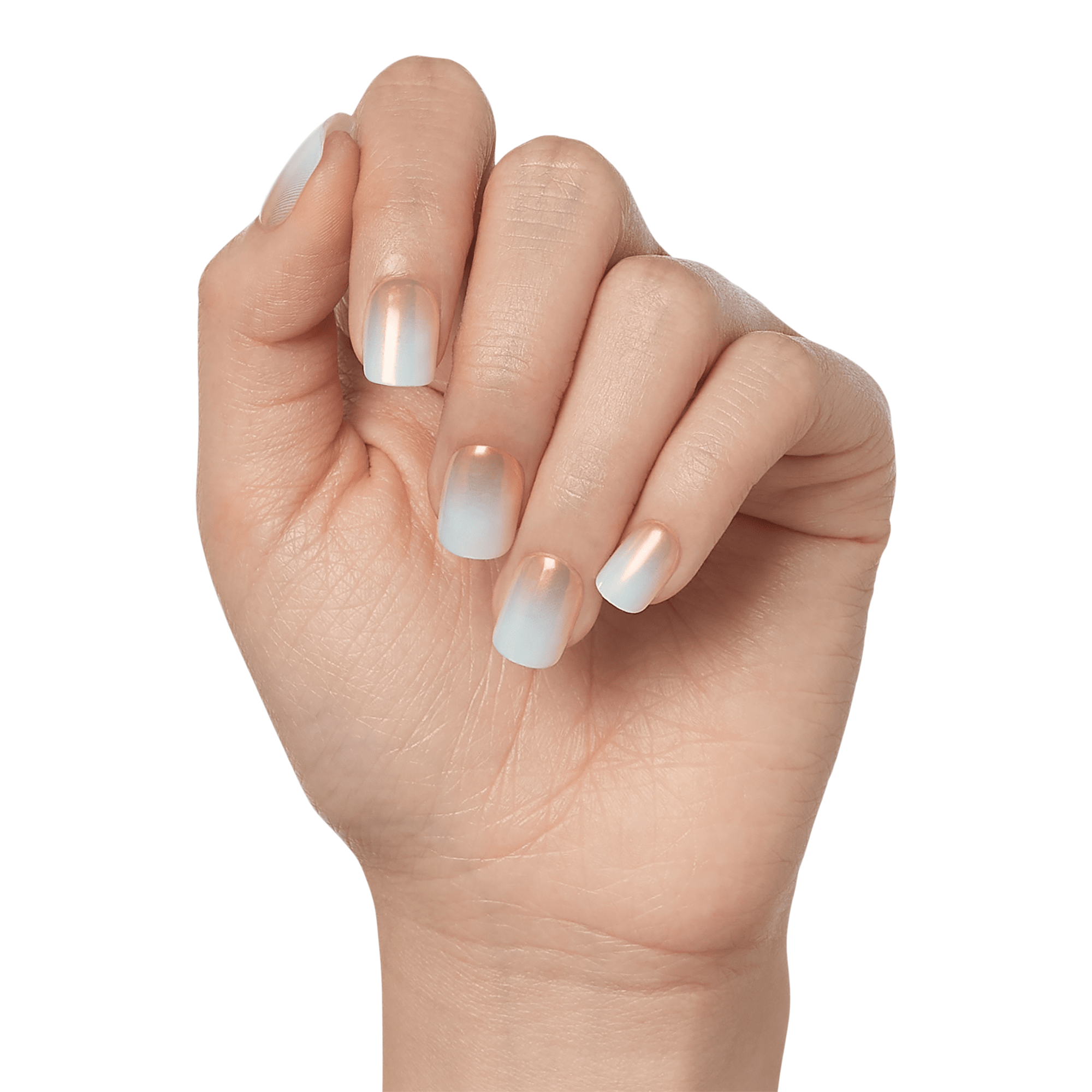 Peel backing from nail then press it down on your natural nail, in the center and at both sides at the same time. Hold for 30 seconds. (Press on thumbnails last.)