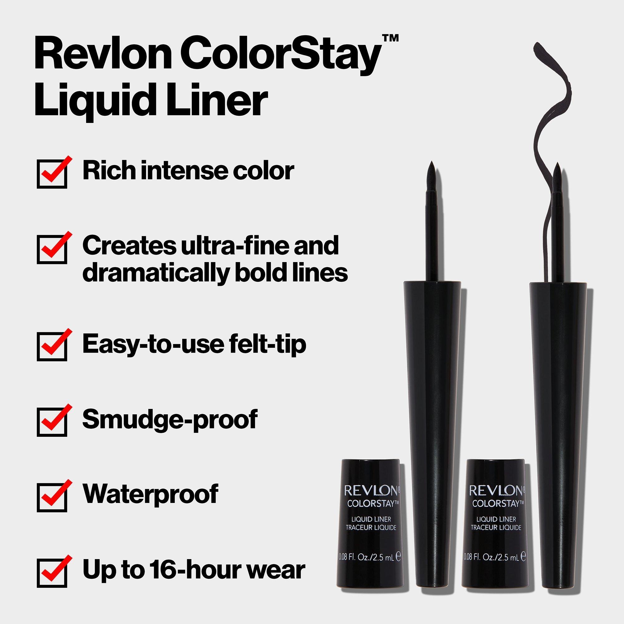 Revlon ColorStay Liquid Eyeliner lasts up to 16 hours without smudging, smearing, or fading. Ultra-fine tip can create precise line and dramatic bold looks.