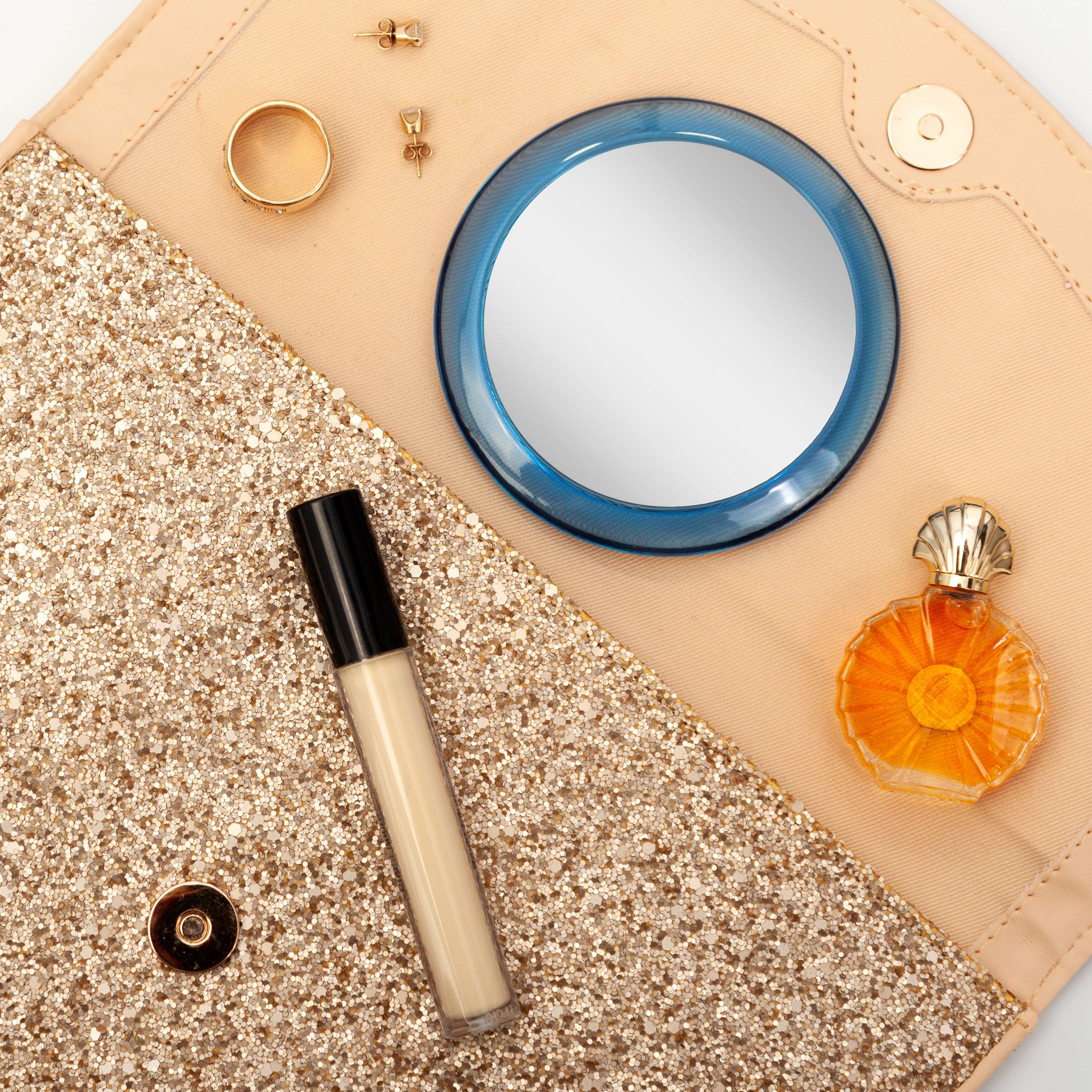 3.75-inch diameter by 0.5-inch deep spot mirror. 3-inch diameter reflective glass mirrors for purse or ideal for home. 5-times and 1-times magnifications.