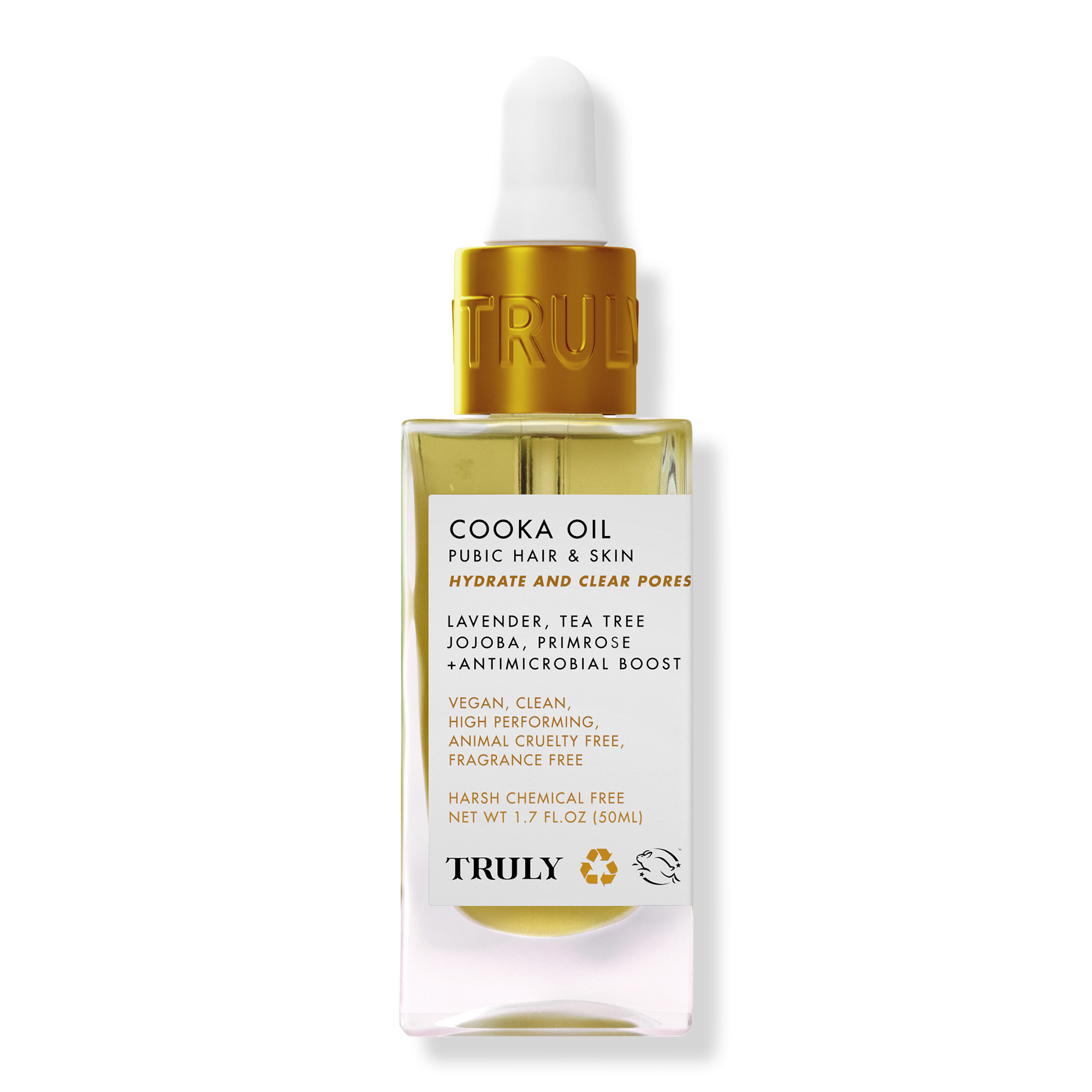Truly Cooka Oil For Pubic Hair & Skin is a silky, lightweight antimicrobial oil for the pubic hair + bikini line that gently soothes irritation, clears pores, combats ingrowns and softens the skin. Use anywhere hair meets skin for grease-free hydration and a noticeably softer texture.