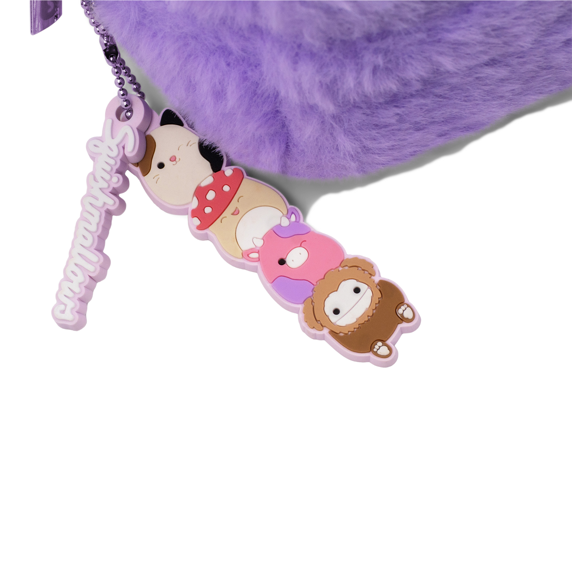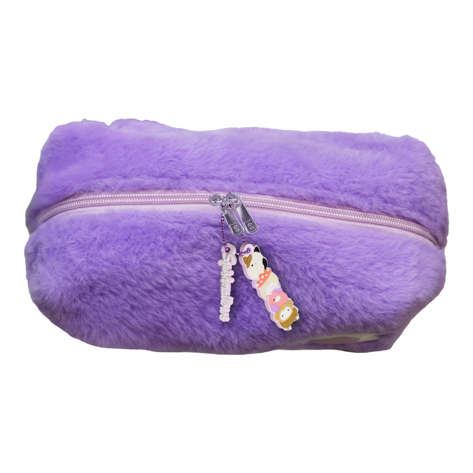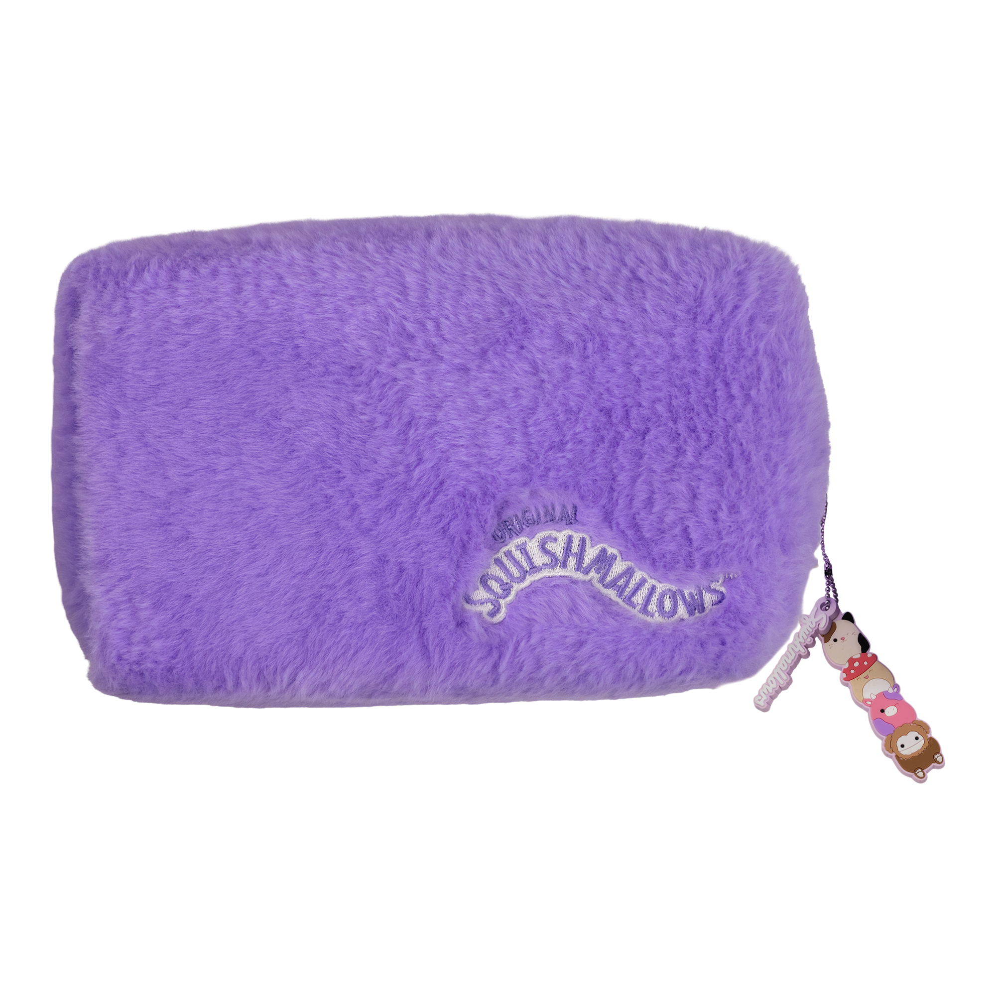 Whether at home or on the go, store your makeup essentials in the Squishmallows Cosmetic Bag. This spacious, Squishmallows-soft pouch with double-zipper closure comes complete with an exclusive charm featuring Benny the Bigfoot, Cam the Cat, Malcolm the Mushroom and Patty the Cow.